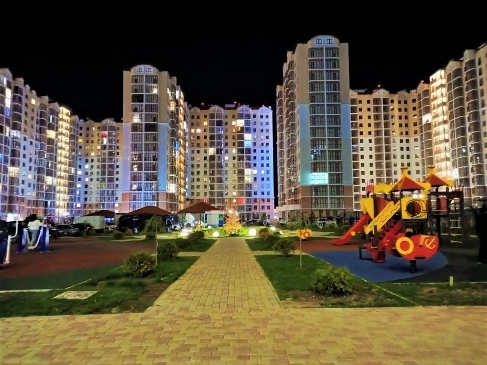 Большая, облагороженная территория с зонами для отдыха, детскими и спортивными площадками.