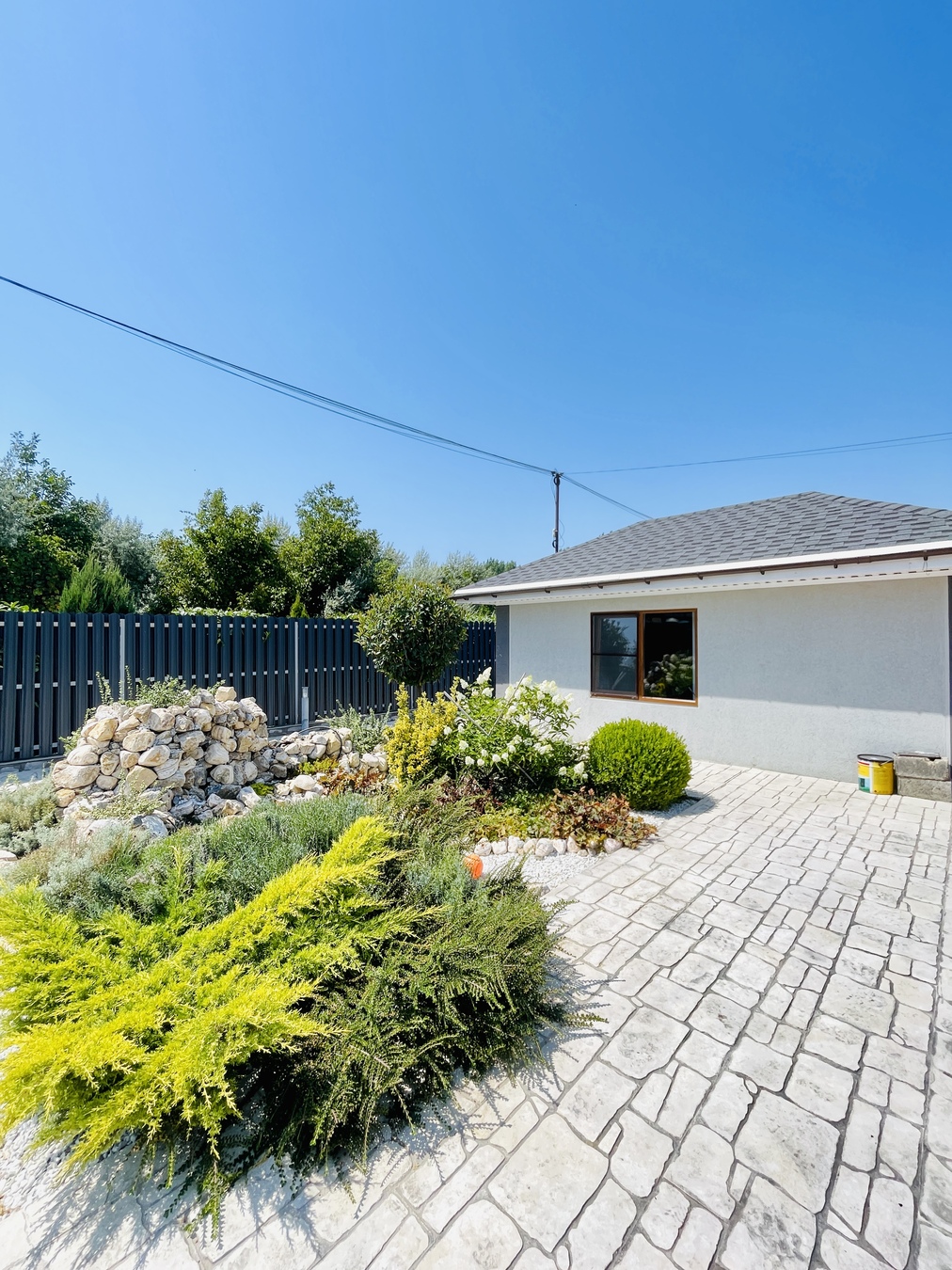 Вся территория выложена прочным печатным бетоном, огорожена штакетным забором с хвойными растениями,