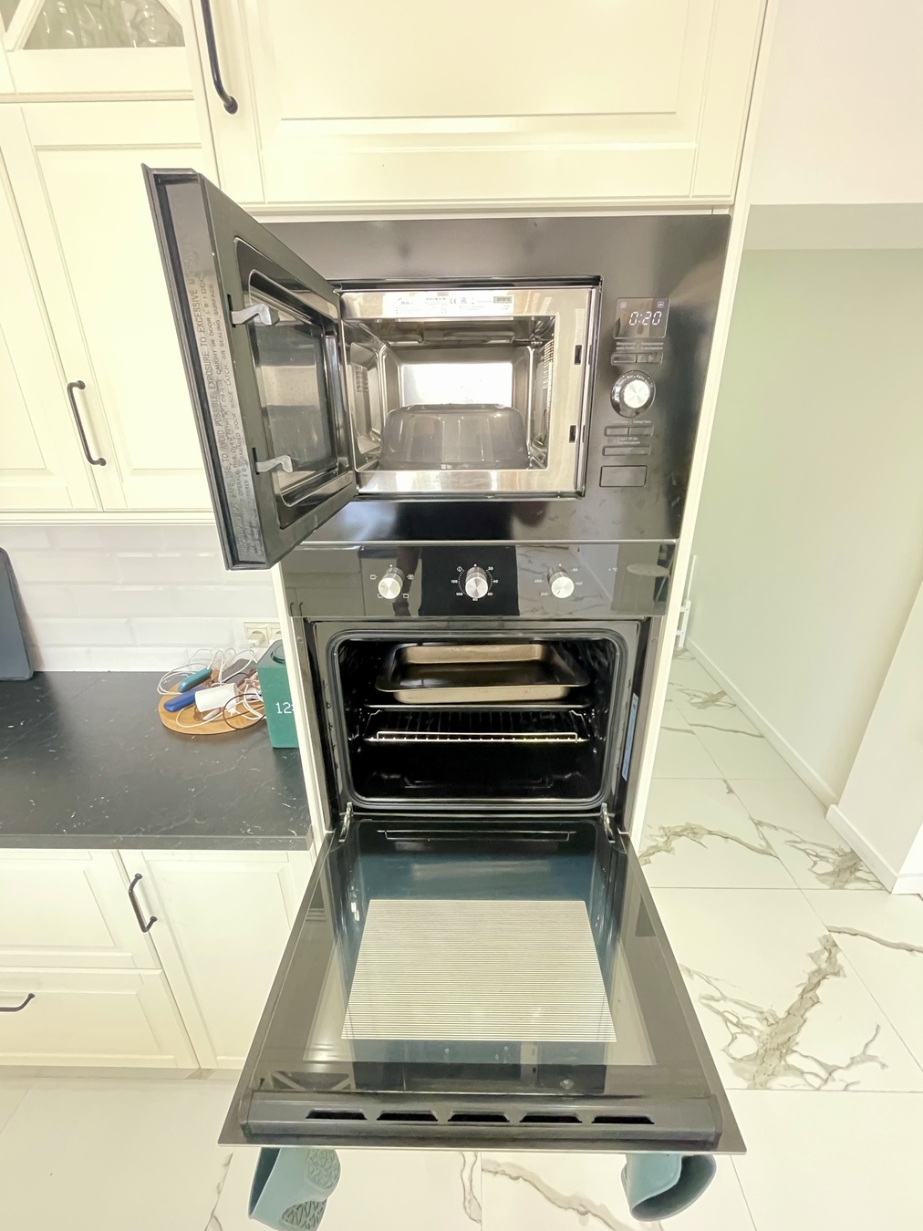 Кухонная зона с встроенной техникой: холодильник, морозильник, индукционная плита, ледогенератор,