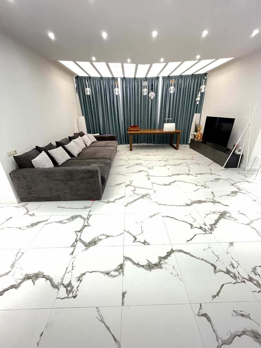 Просторная гостиная с диваном 2×4 м и телевизором 65",