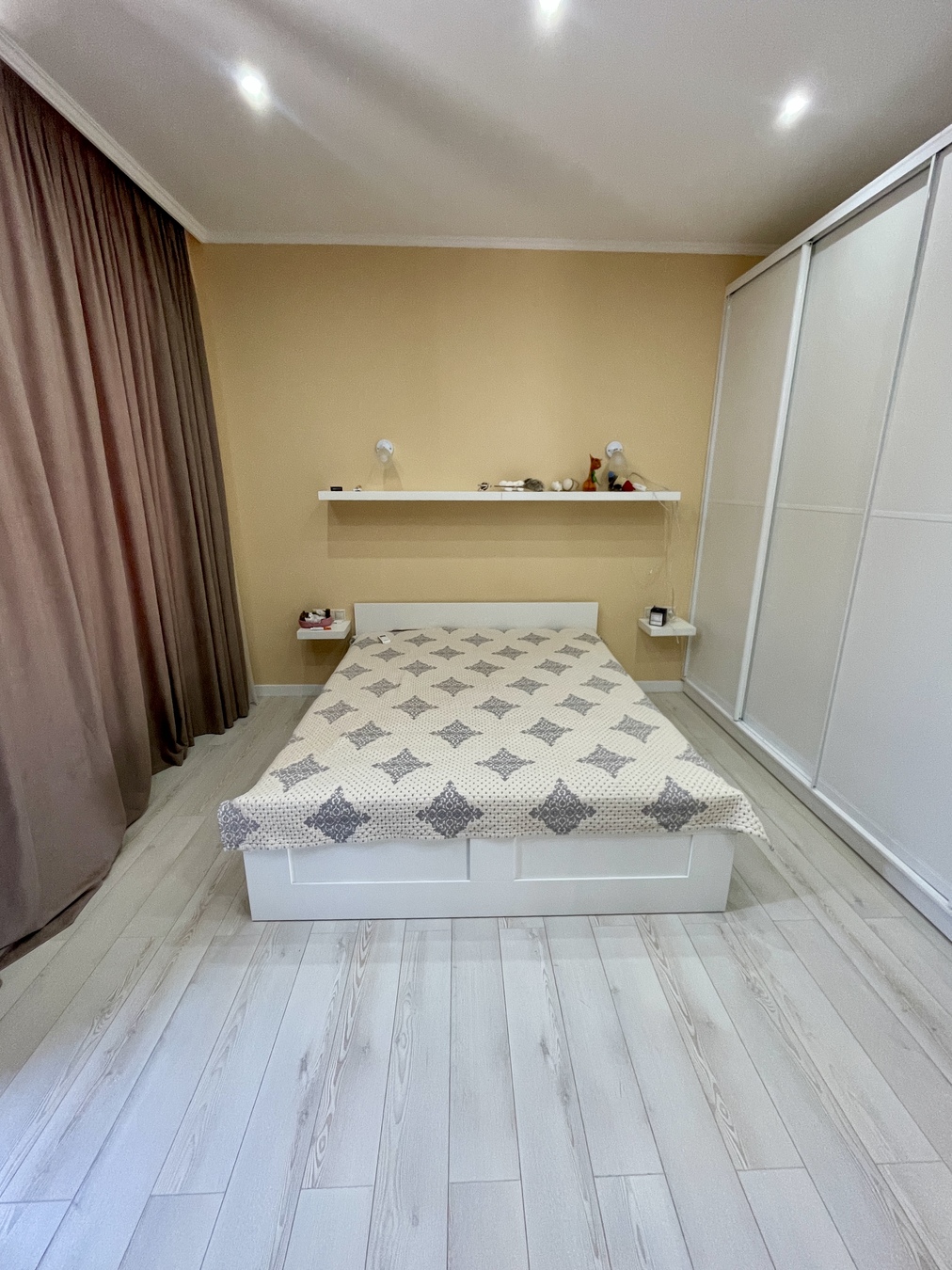Спальня с панорамными окнами, гардеробной и телевизором, пол — ламинат,