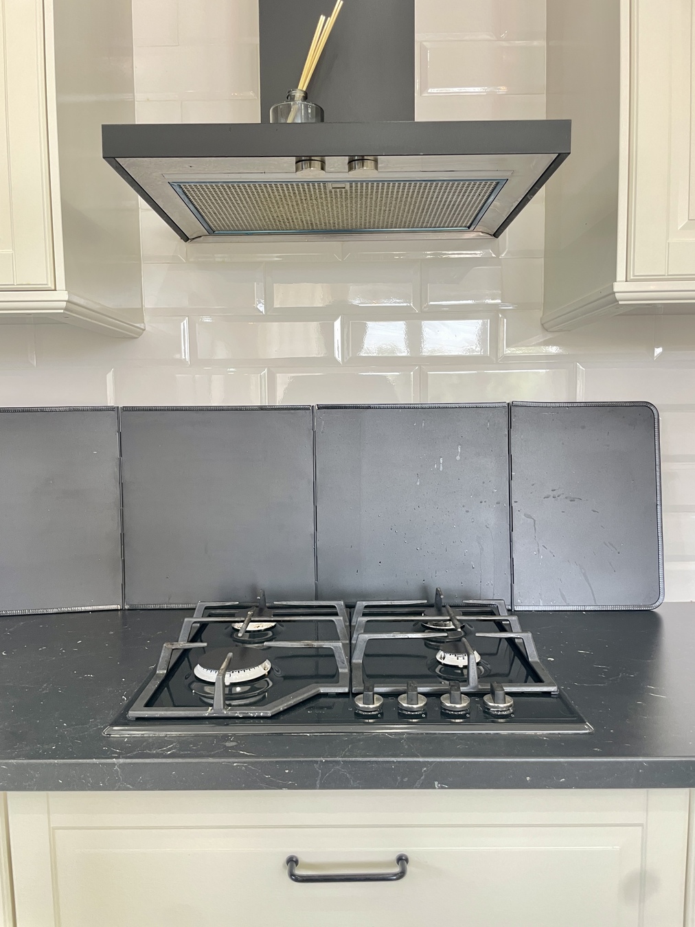 Кухня-гостиная 45 м² с высокими потолками (4 м) и премиальной техникой (немецкая газовая плита, встроенная микроволновка и духовка, кофемашина, холодильник Samsung, морозильник),
