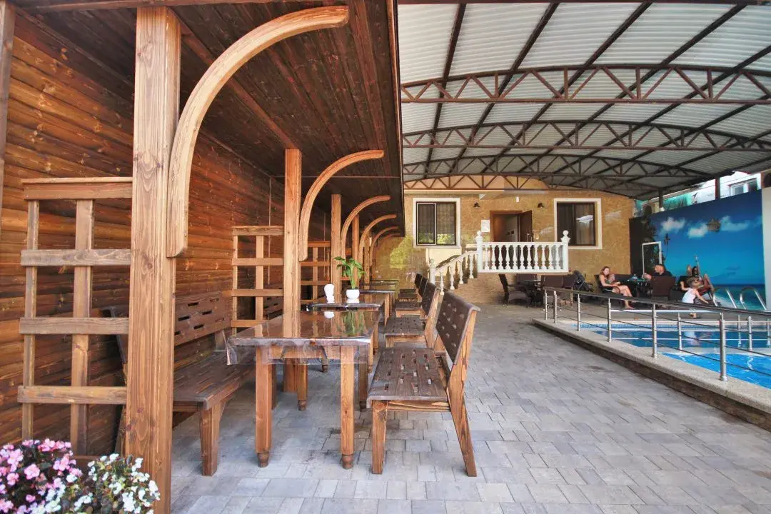 Обеденная зона размещена на улице под уютными навесами.