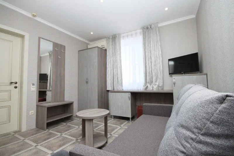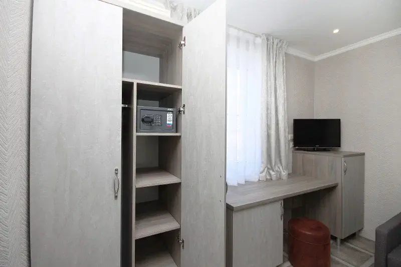 Качественная шумоизоляция, кондиционер, утюг и телевизор, сейф, холодильник, фен, качественная профессиональная мебель, текстиль-в каждом номере.