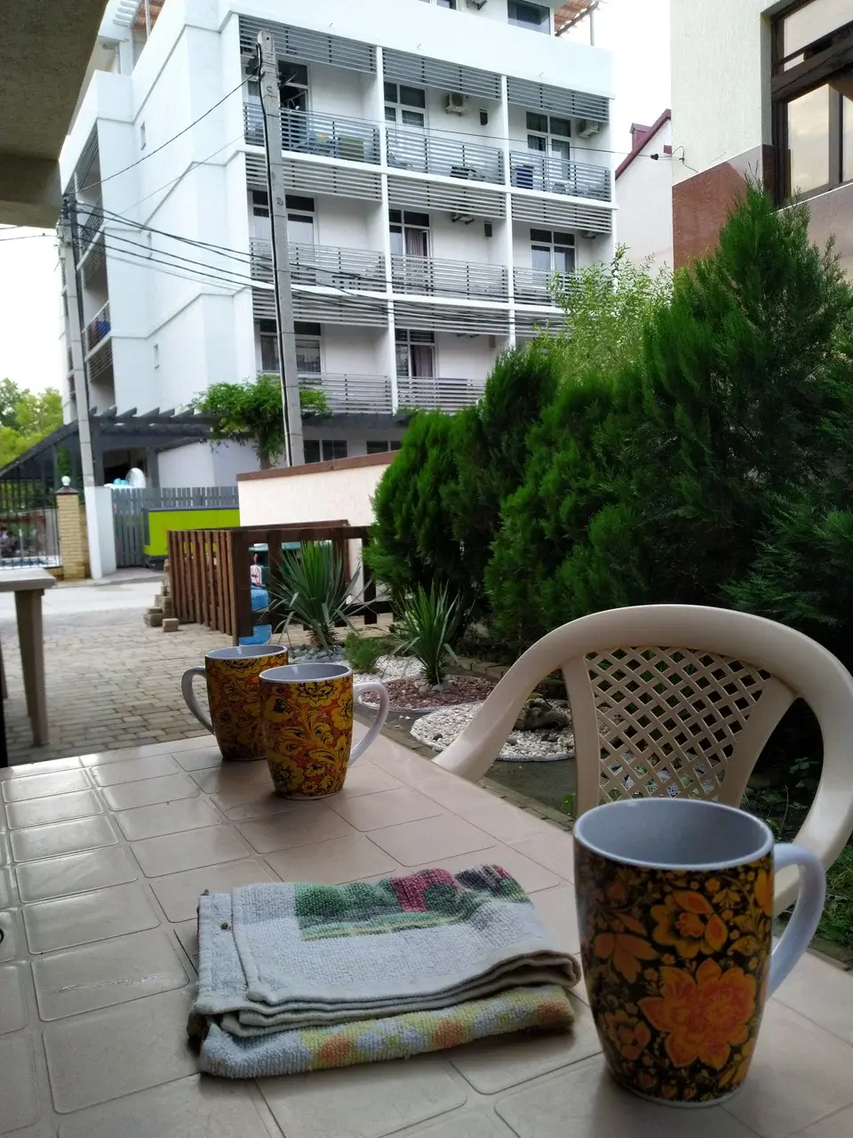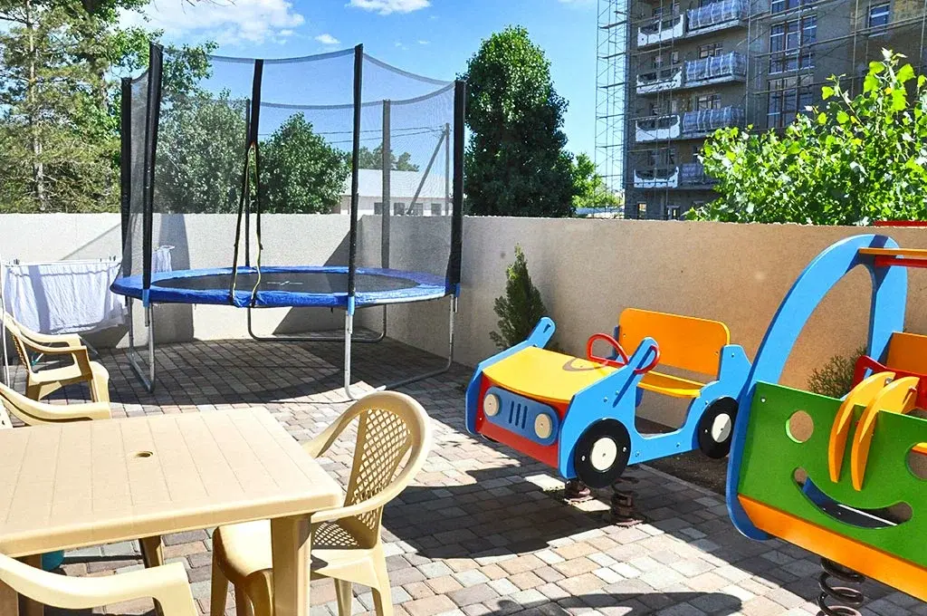 Детская игровая площадка, мангал, столы и стулья во дворе и на балконах