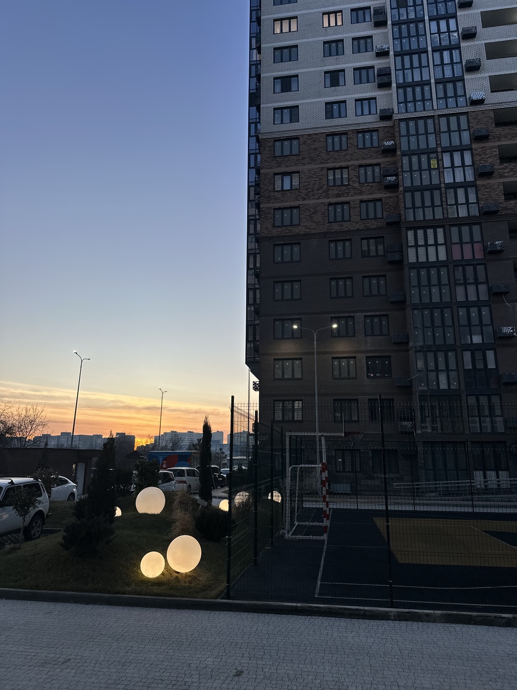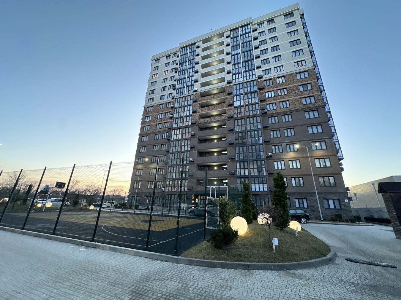 Обустроенный двор с ландшафтным дизайном, детскими и спортивными площадками, велопарковками.