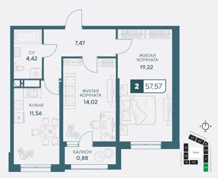 В продаже полноценная двухкомнатная квартира общей площадью 57.5 кв метров. Две жилой комнаты 19.2 и 14 кв,кухня 11.5 кв ,коридор 7.4 кв,су 4.4 кв, балкон 0.8 кв.