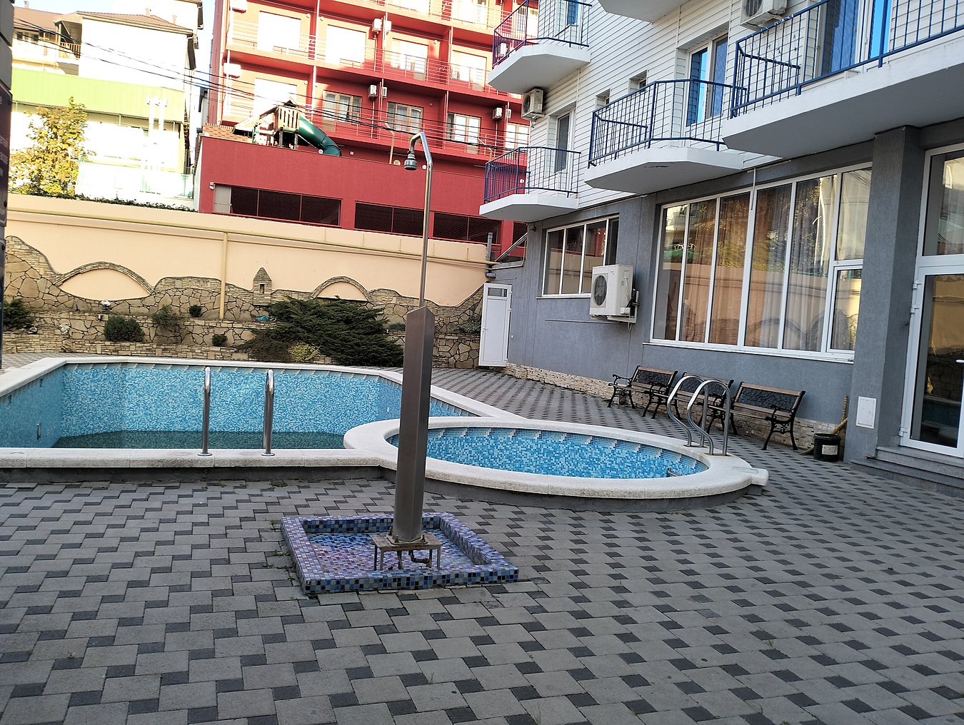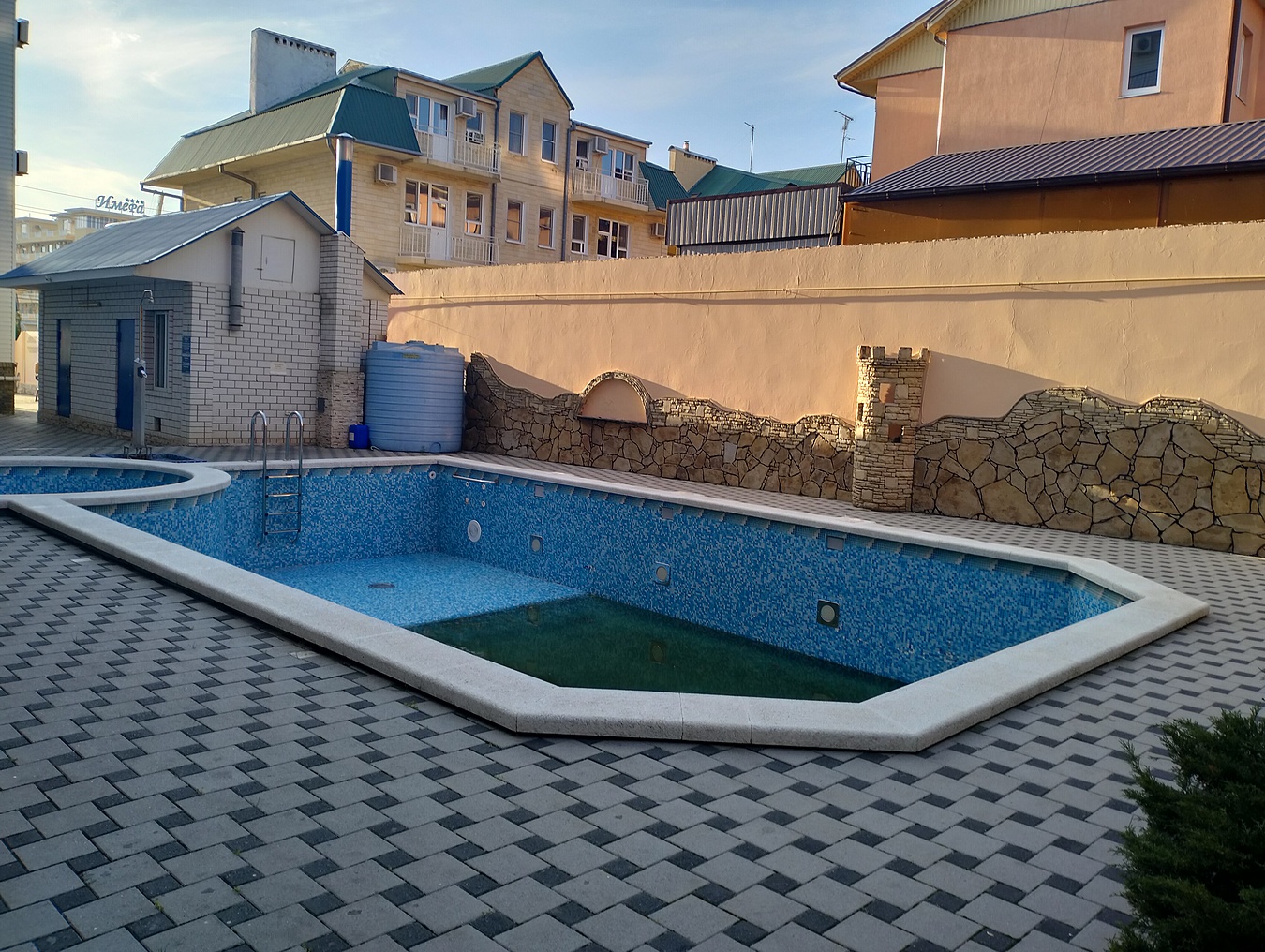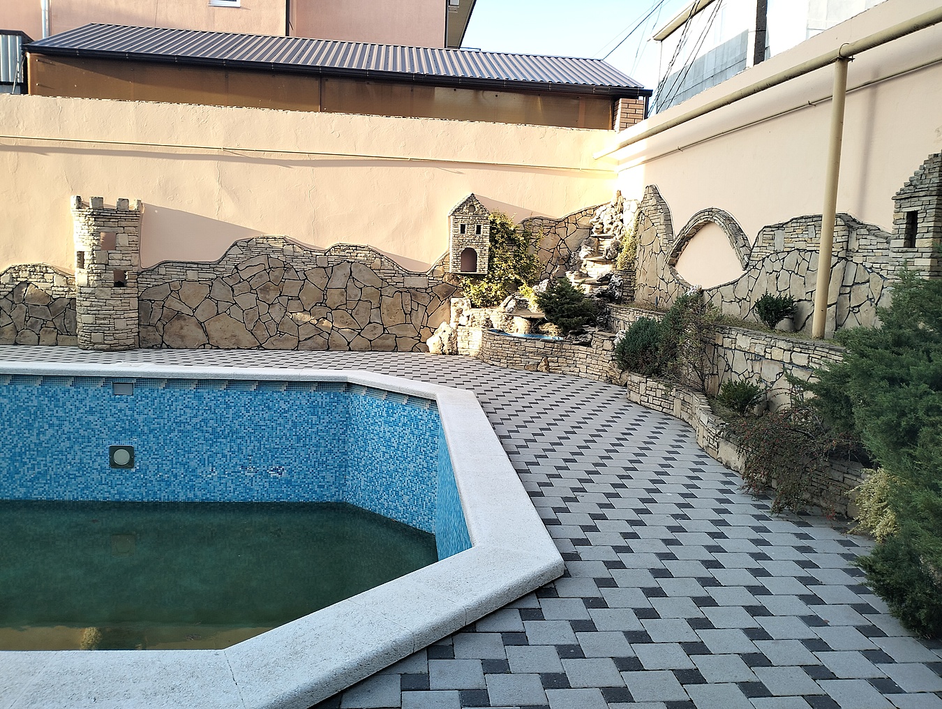 шикарный бассейн с настоящим подогревом, водопадом, гейзером и джакузи;