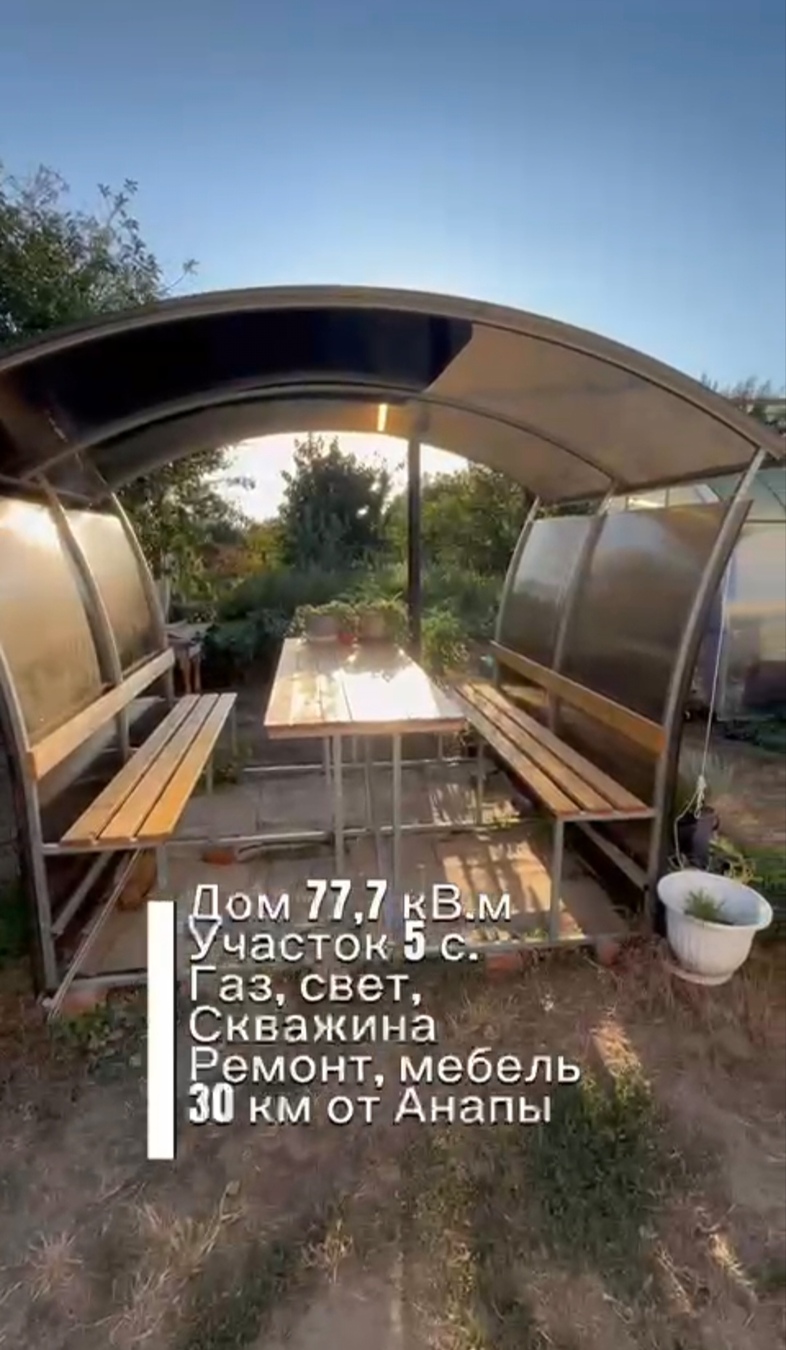 Дом свежий 2022 г.п. (уже устоялся). Сделан качественный ремонт - натяжные потолки, кафель, ламинат, новая техника и мебель, хороший кухонный гарнитур, установлены сплит-системы, гардеробная комната, тёплые полы. Удобная планировка: 2 спальные комнаты и кухня-гостиная. Около дома есть навес (18х6 м - монокарбонат) и теплица. На участке есть плодовые деревья - вишня, яблоня, гранат, персик, инжир, абрикос.