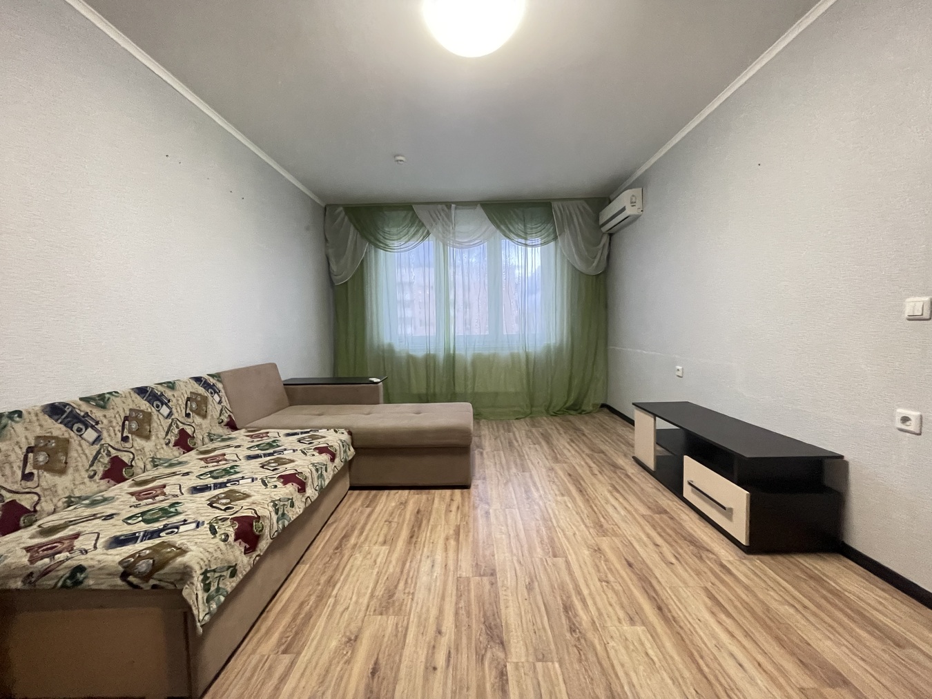 Жилая комната очень просторная, легко разграничить спальную и гостевую зону.