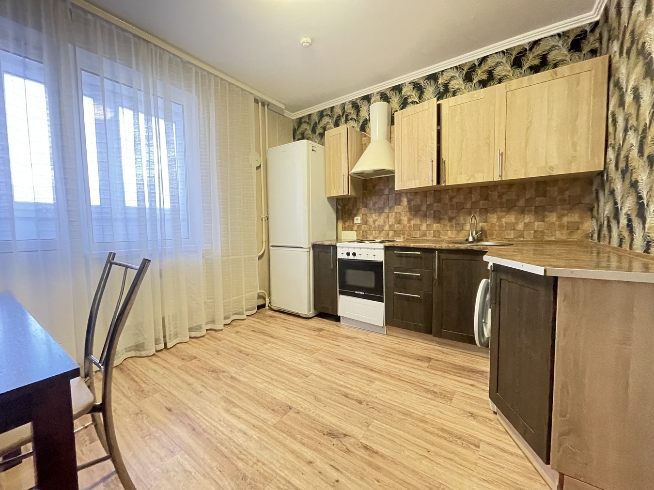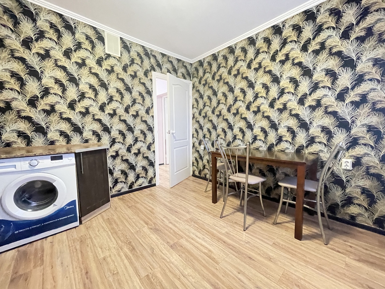 Кухня правильной квадратной формы, обеденная зона не занимает пространство возле гарнитура поэтому остается место для свободного прохода.