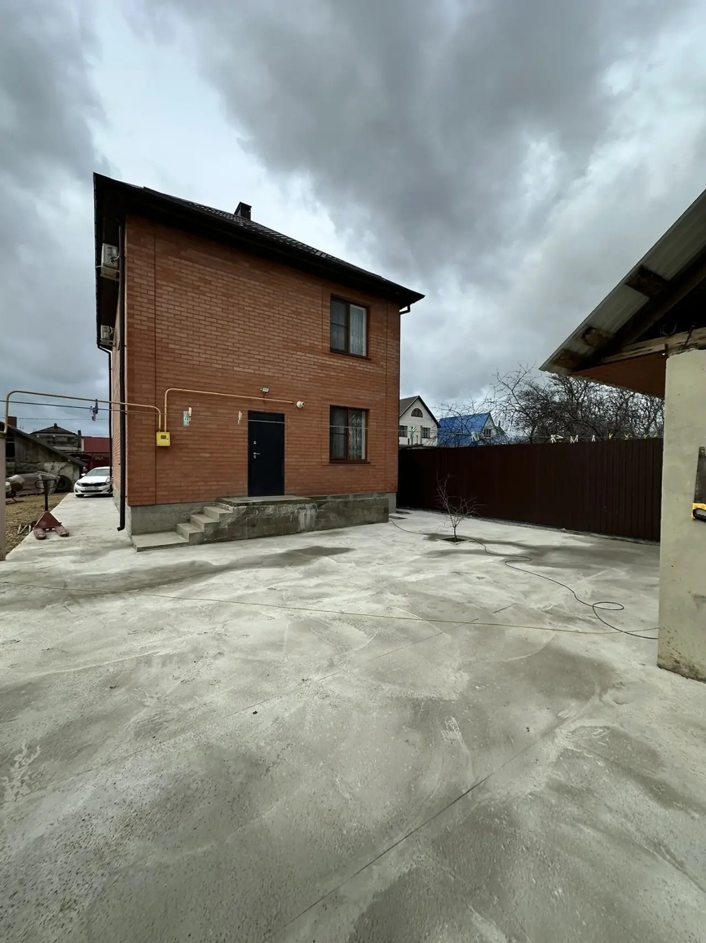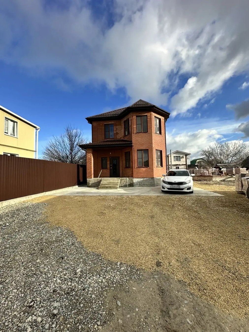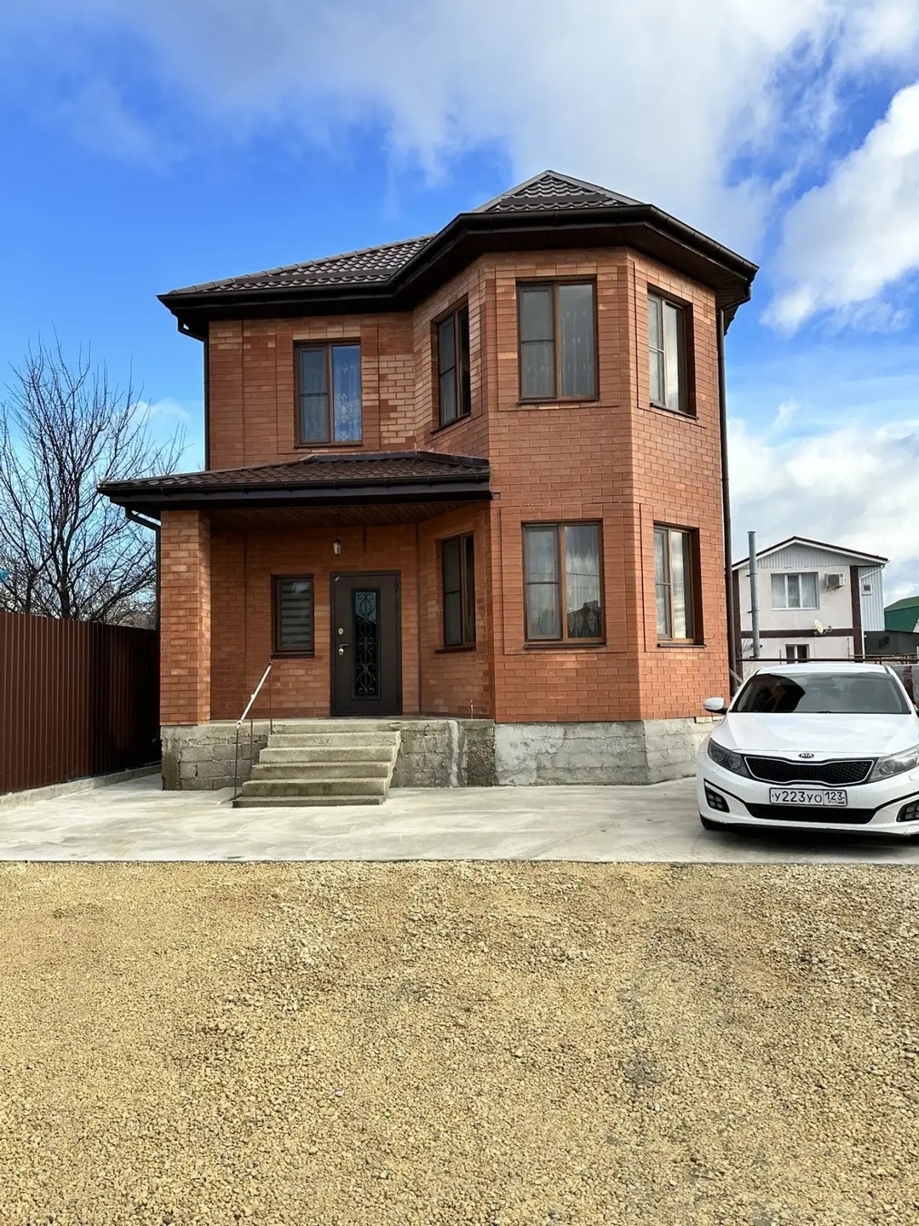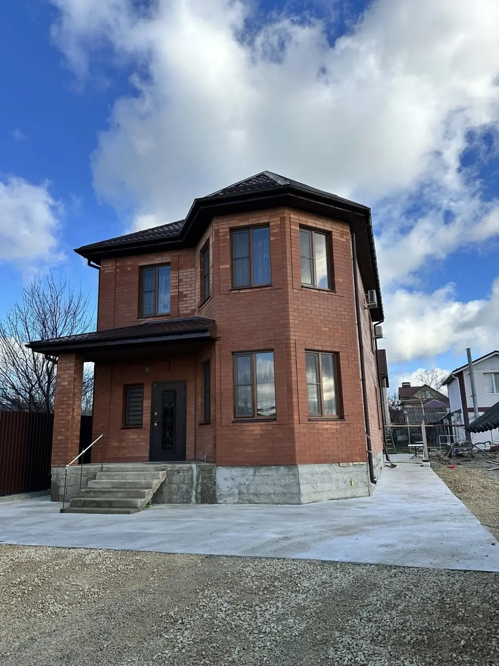Дом кирпичный, вокруг дома выложена плитка.Красивый ремонт, дорогие материалы,шикарная лестница, дорогая бытовая техника.