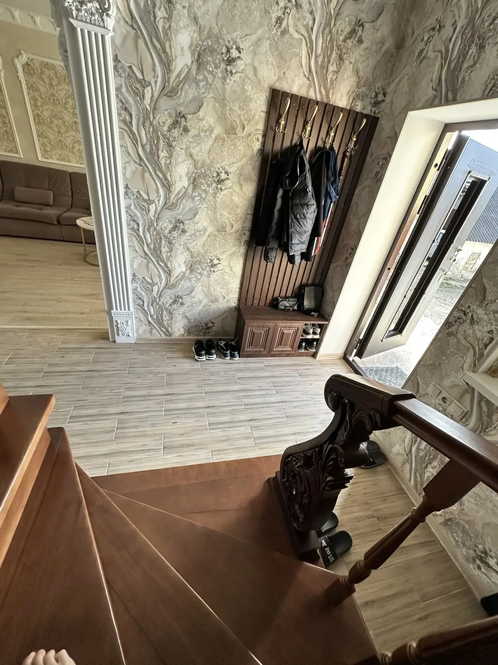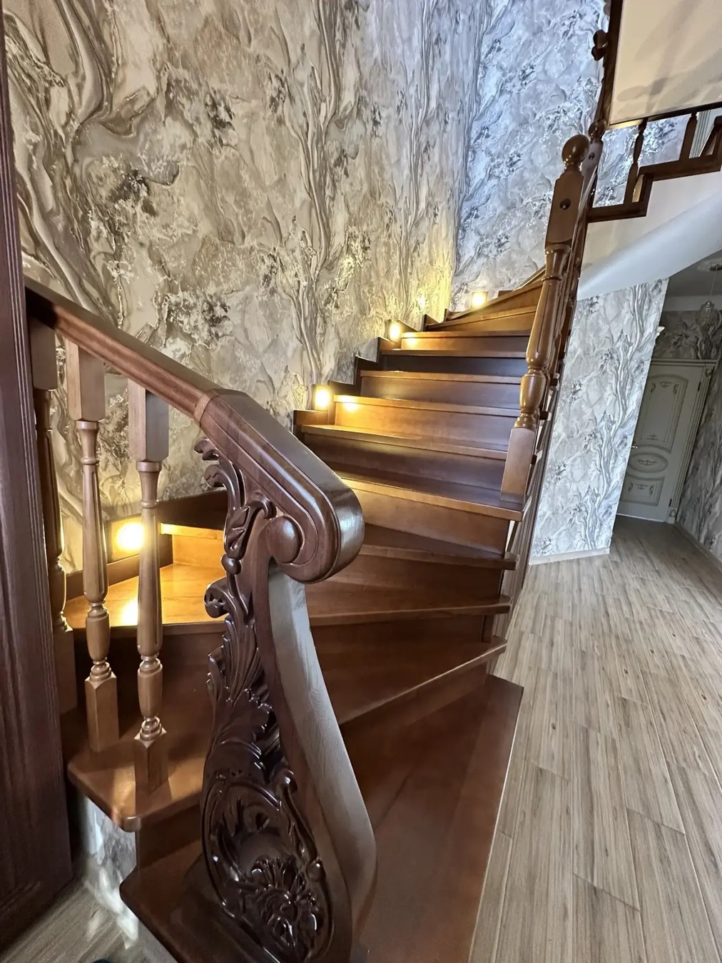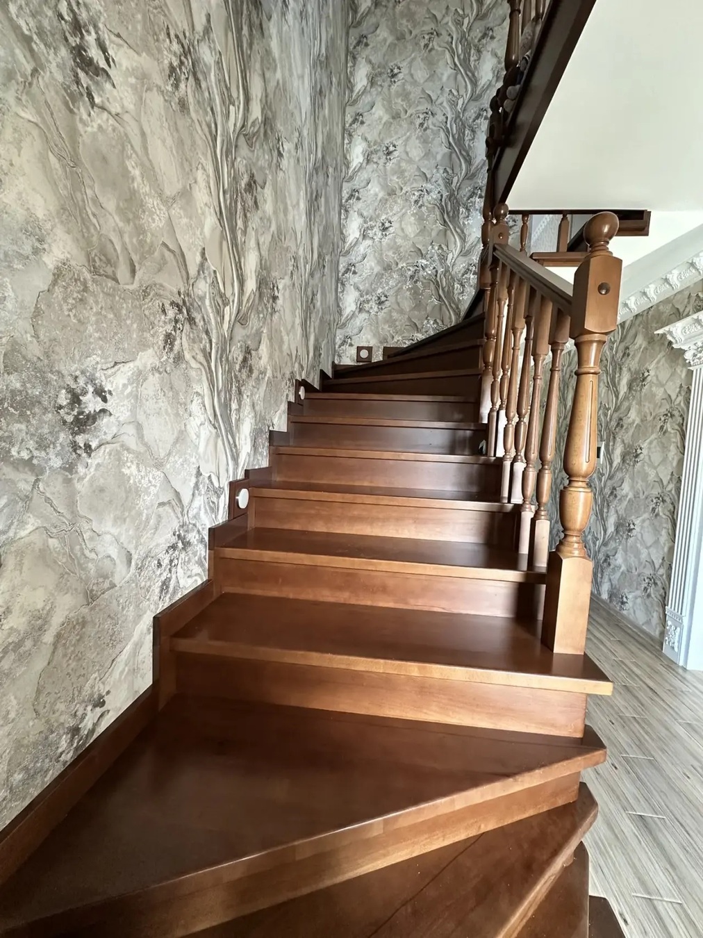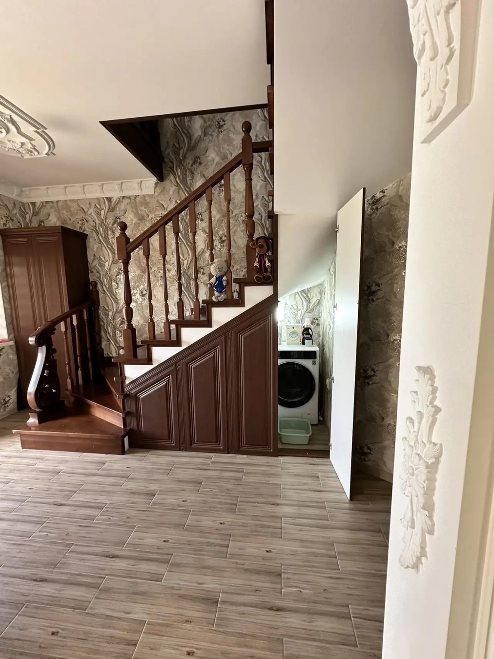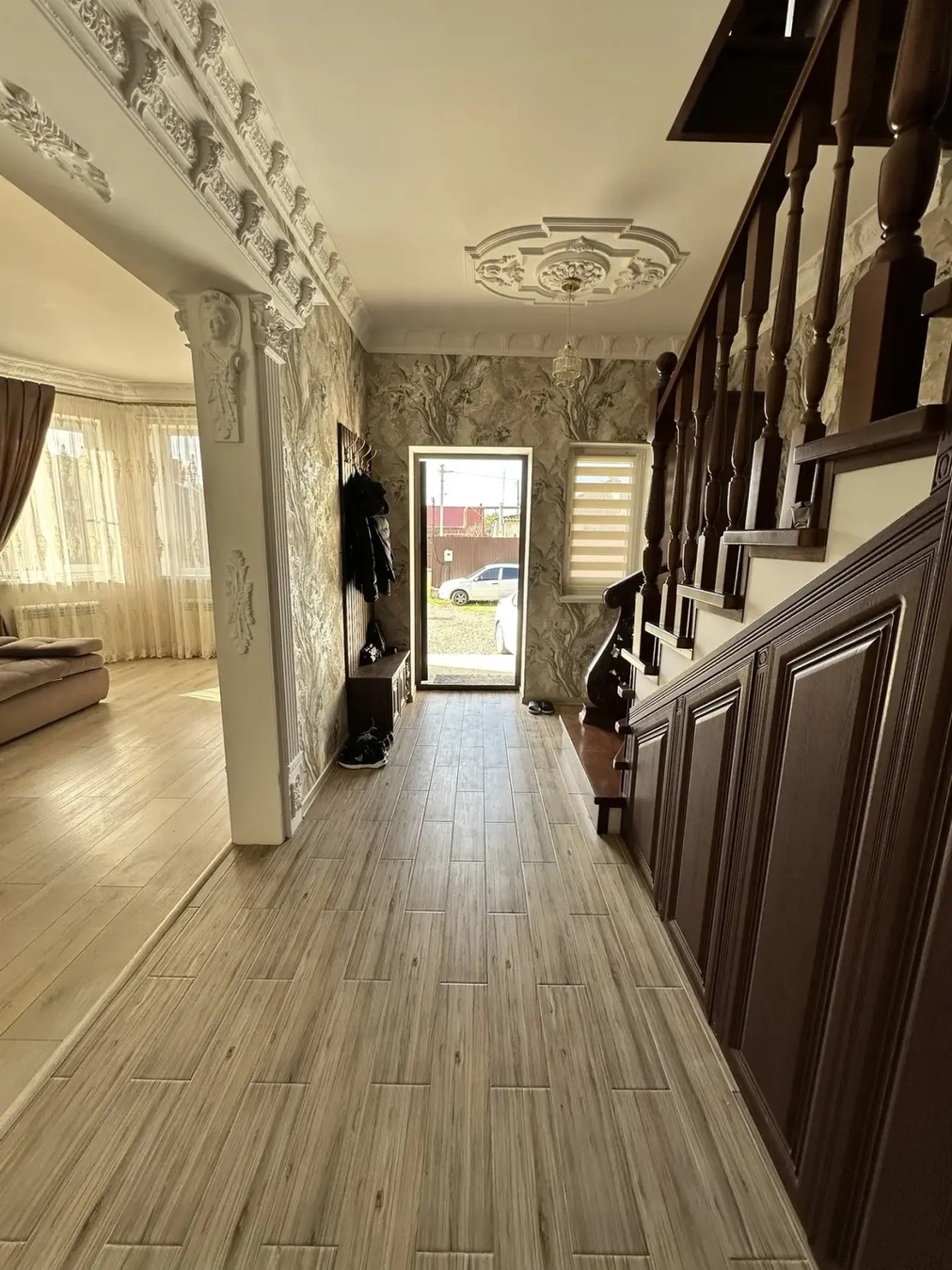 Дом кирпичный, вокруг дома выложена плитка.Красивый ремонт, дорогие материалы,шикарная лестница, дорогая бытовая техника.