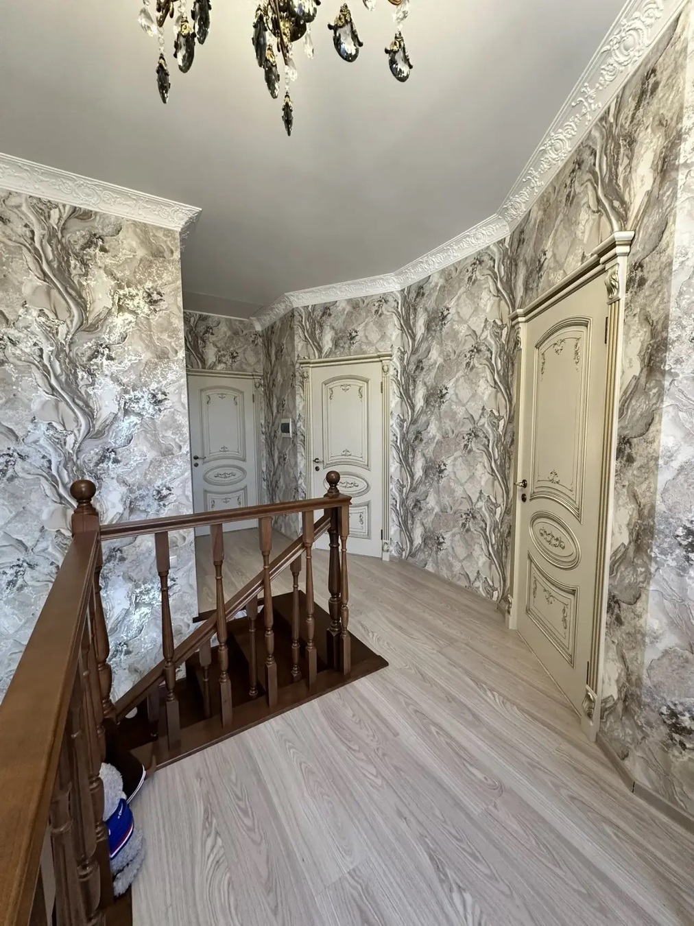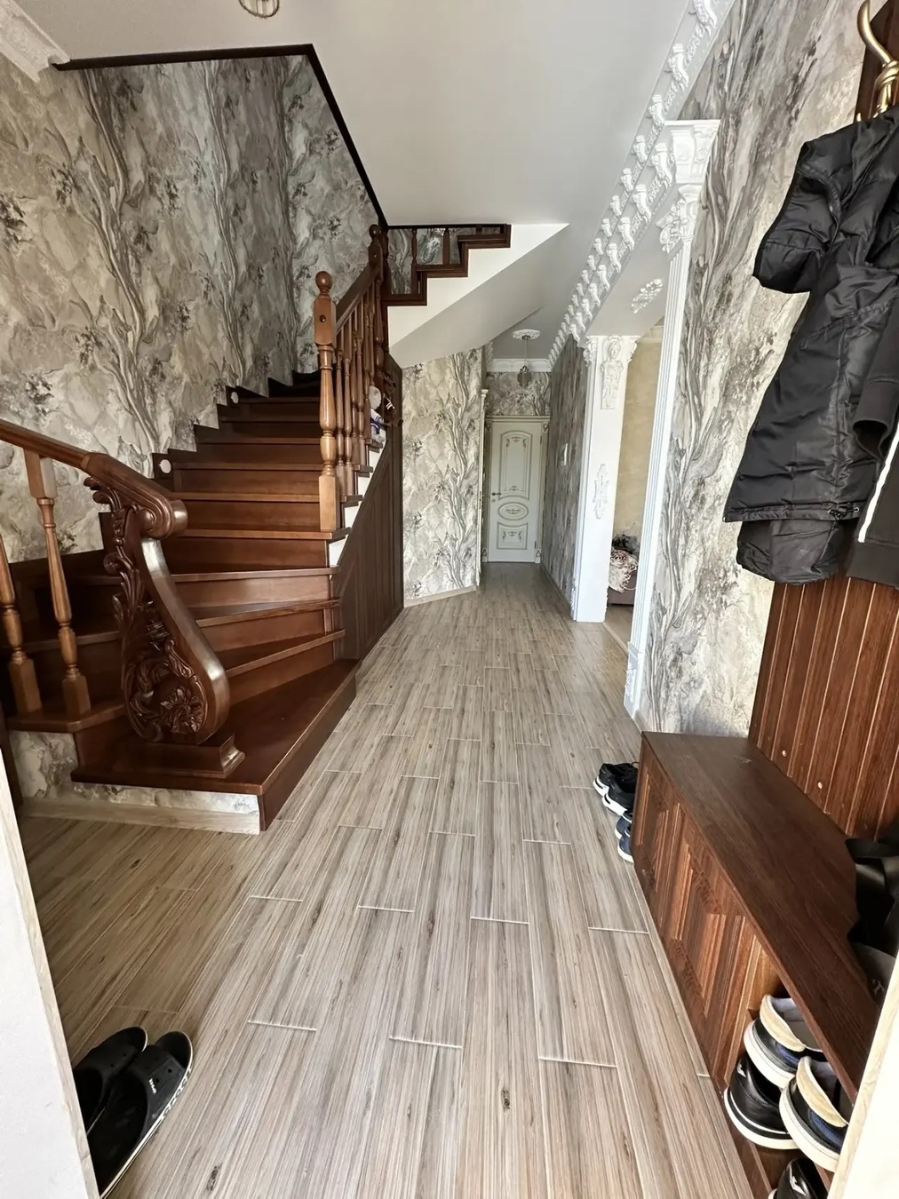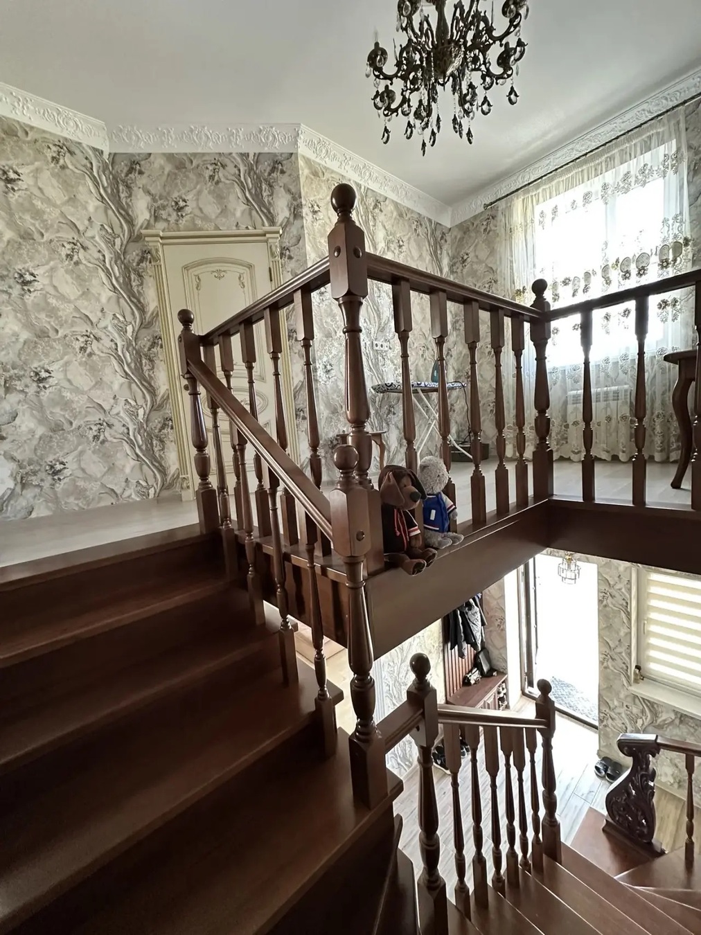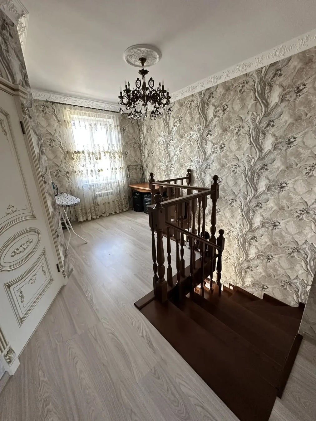 Большая кухня столовая, зал с высокими потолками ,на первом этаже две раздельных спальни и на втором этаже 3 раздельных спальни.