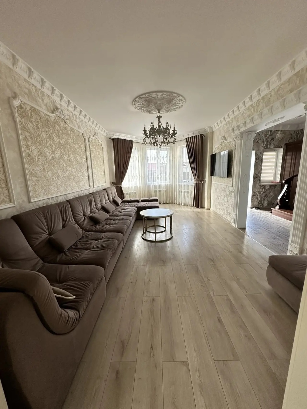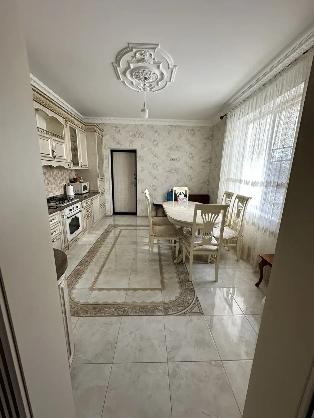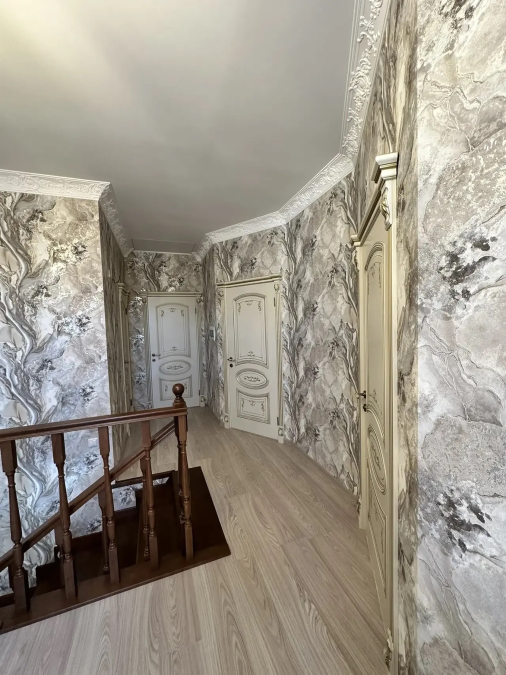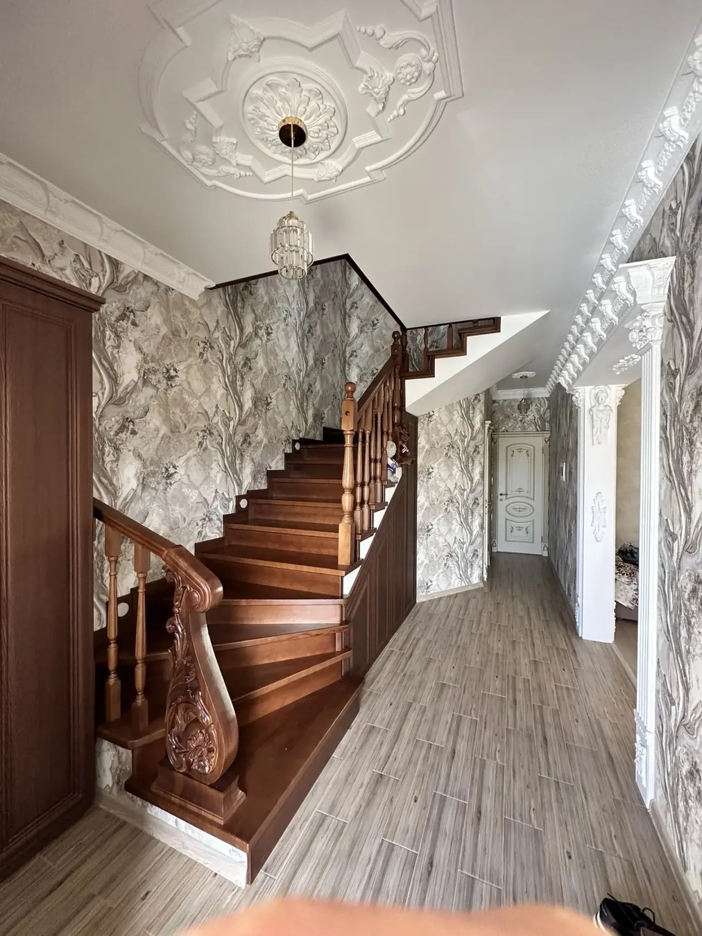 Большая кухня столовая, зал с высокими потолками ,на первом этаже две раздельных спальни и на втором этаже 3 раздельных спальни.