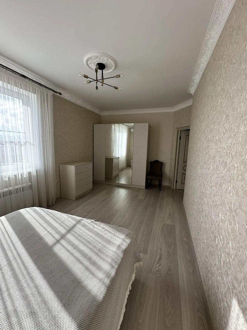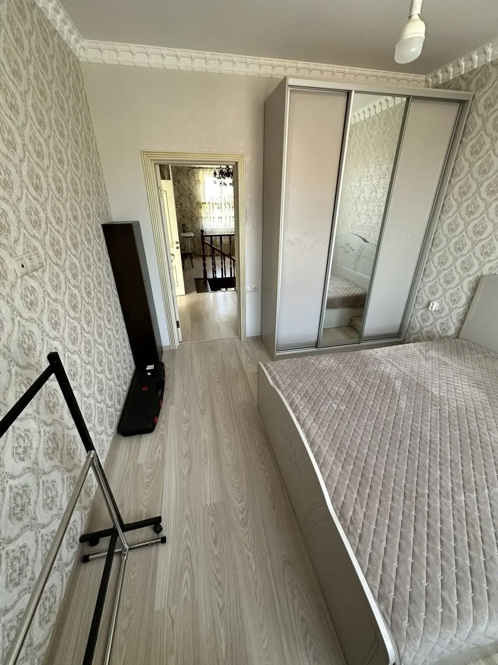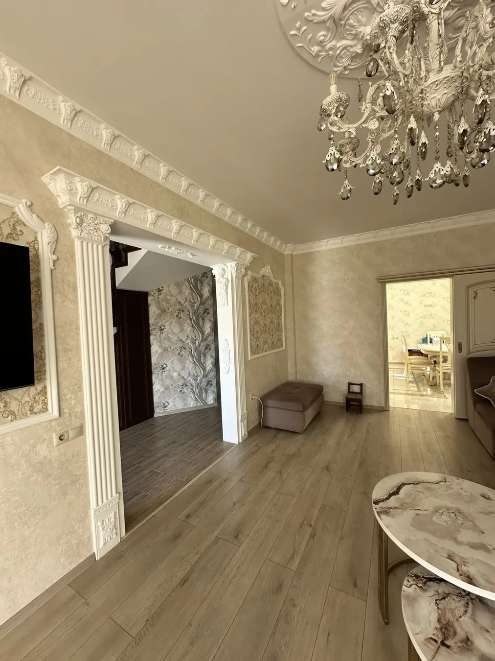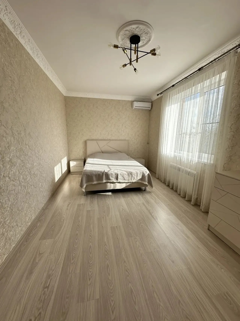 Большая кухня столовая, зал с высокими потолками ,на первом этаже две раздельных спальни и на втором этаже 3 раздельных спальни.