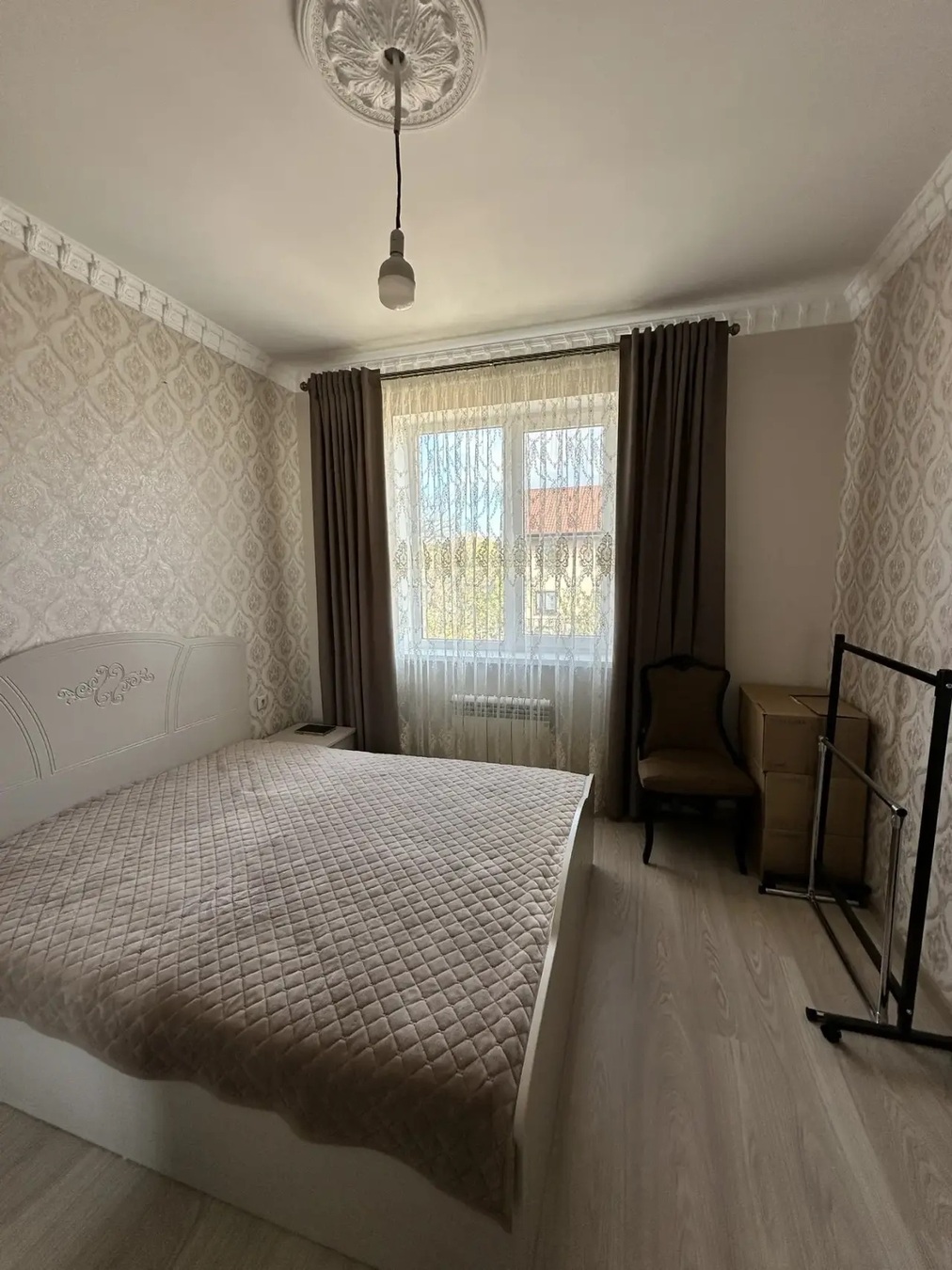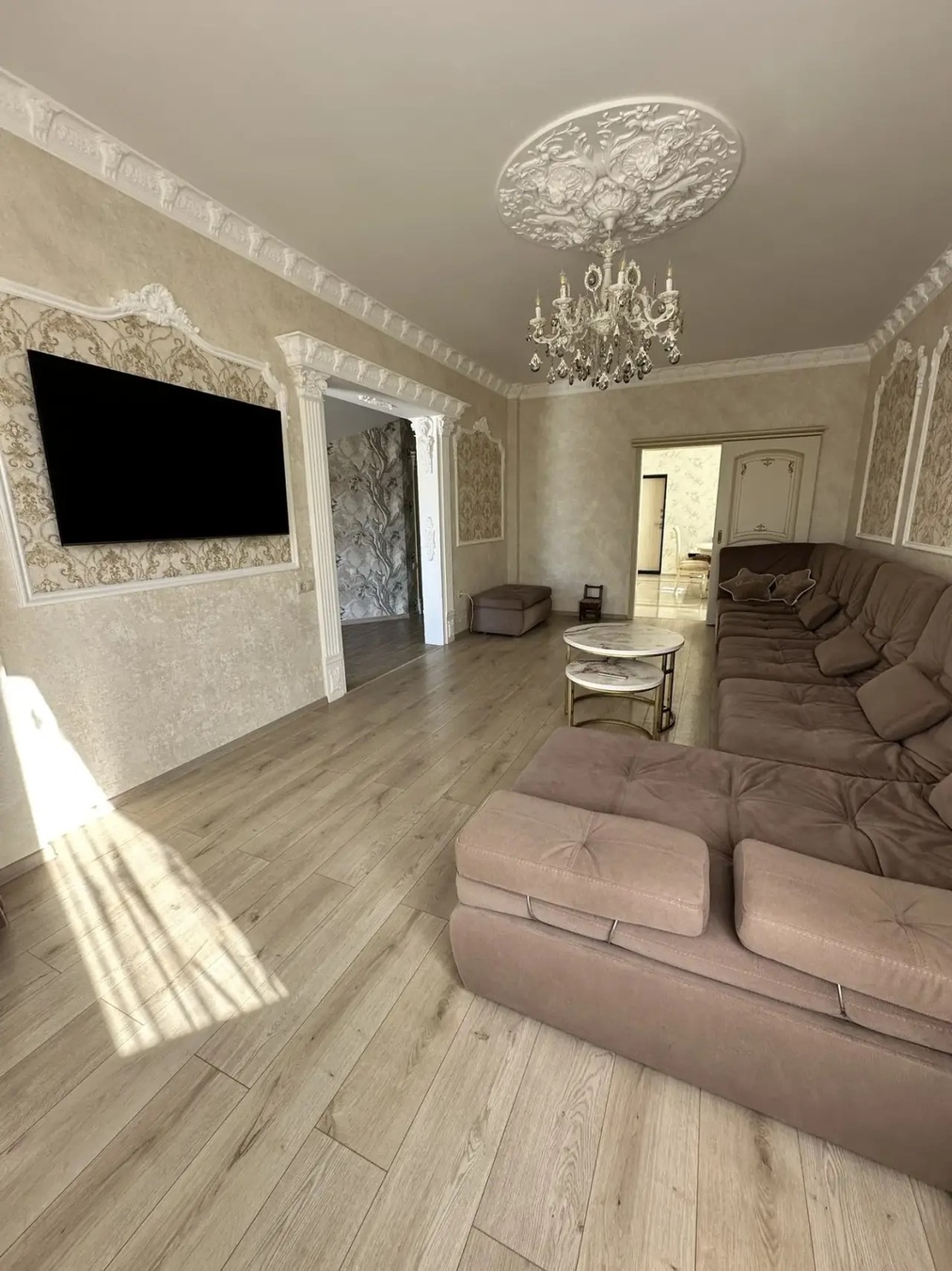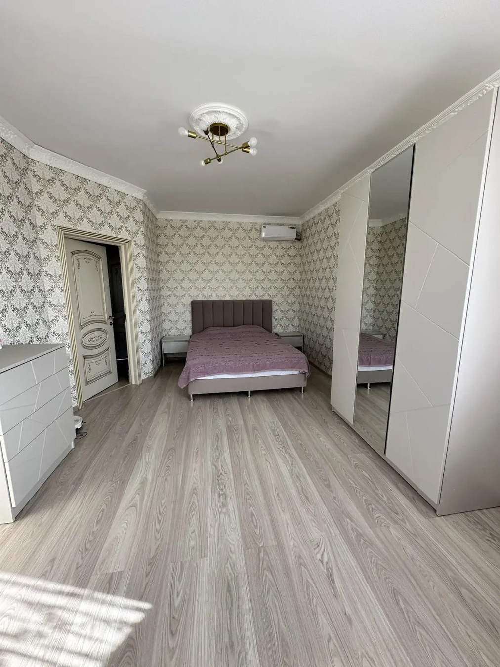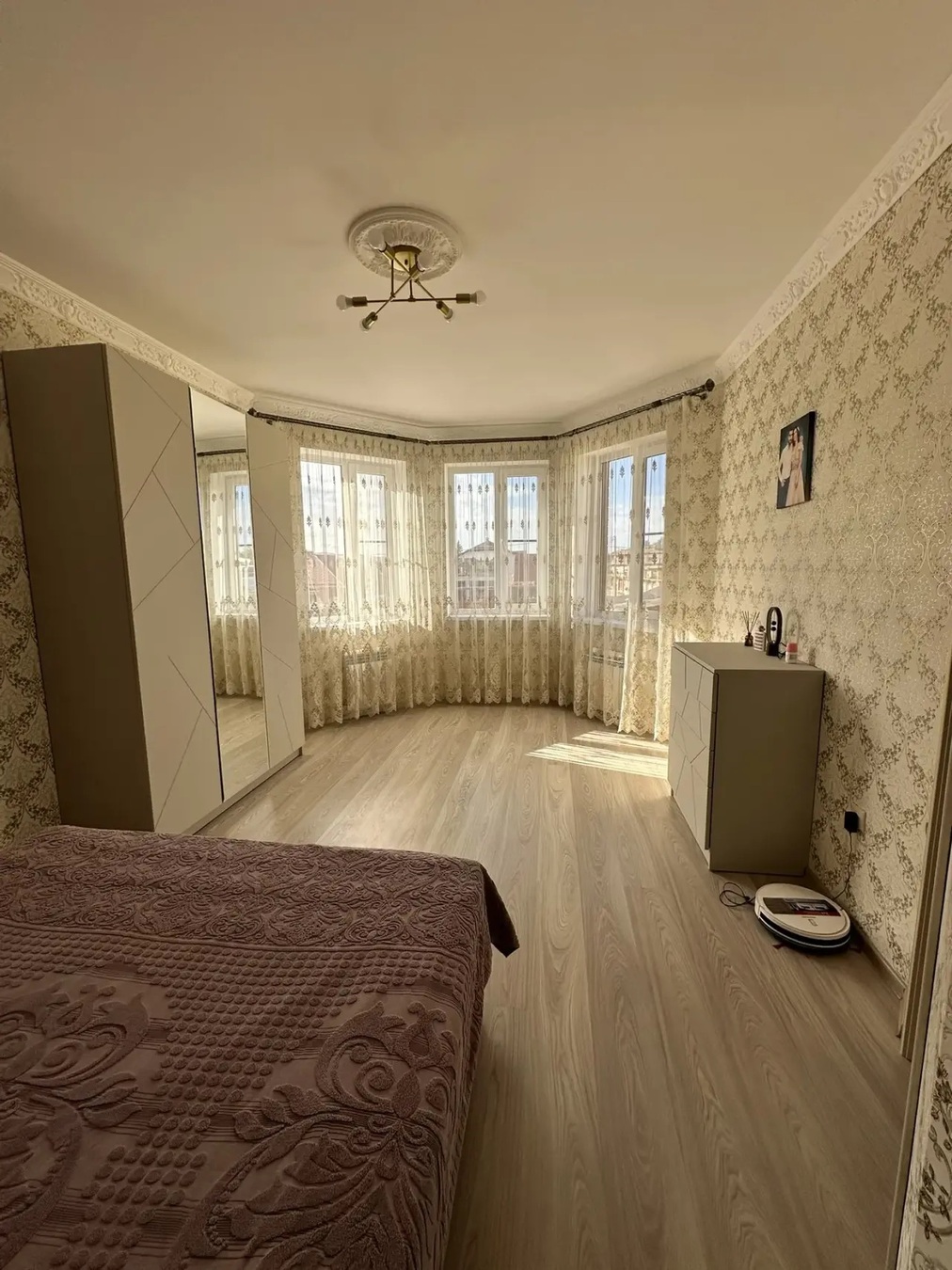 Большая кухня столовая, зал с высокими потолками ,на первом этаже две раздельных спальни и на втором этаже 3 раздельных спальни.