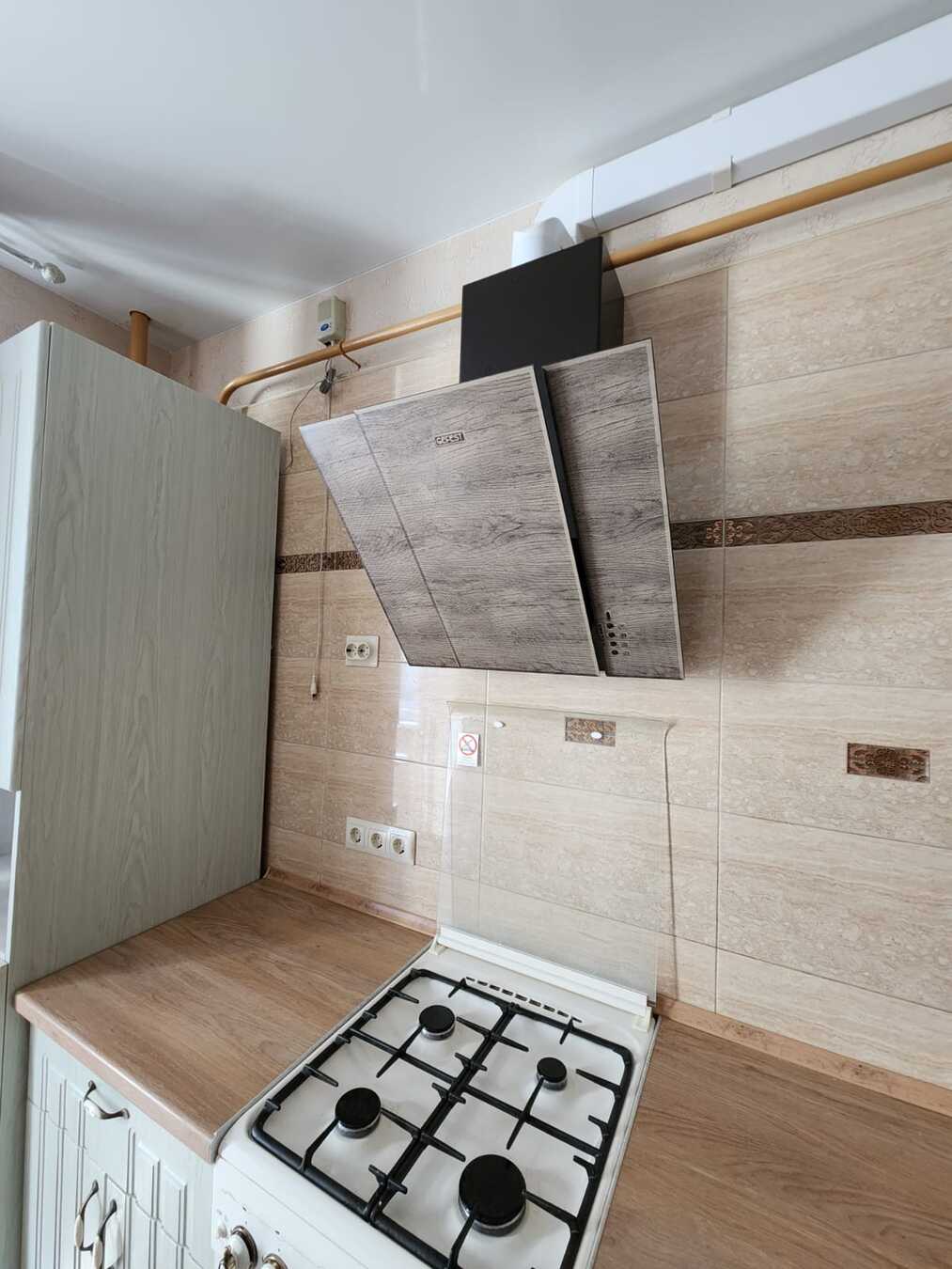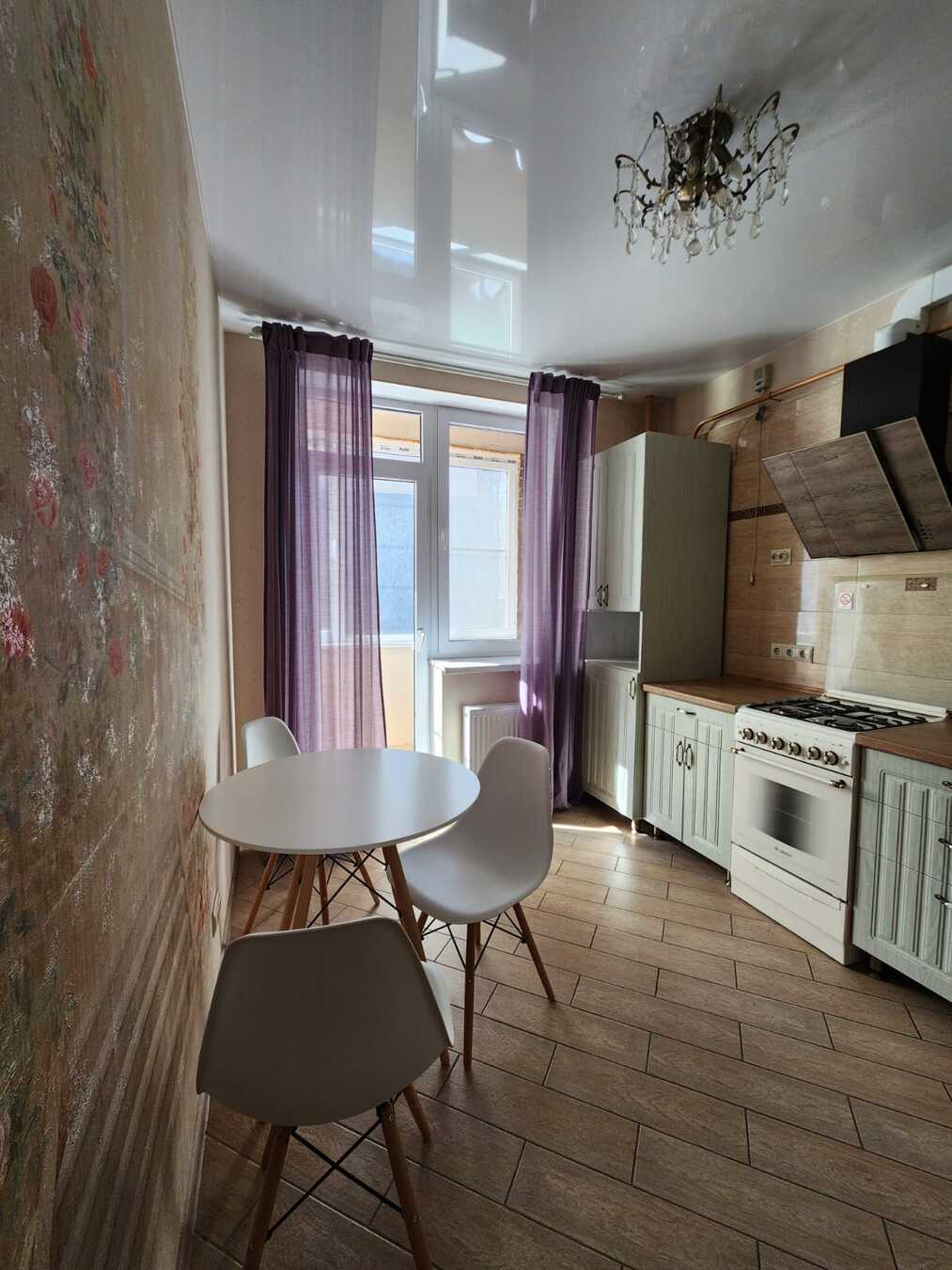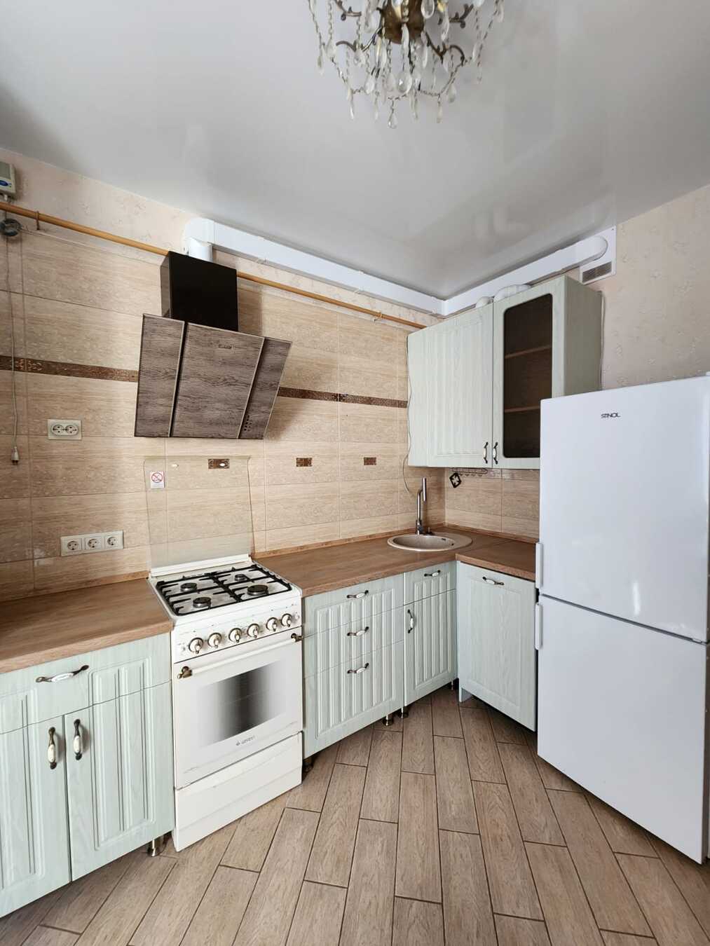 В кухне остается - кухонная мебель, вытяжка, газовая плита, холодильник, обеденный стол со стульями