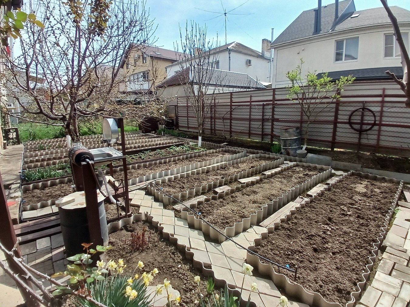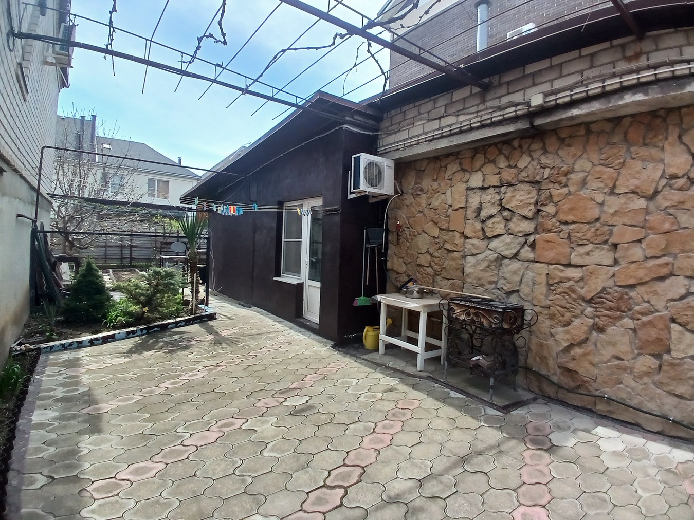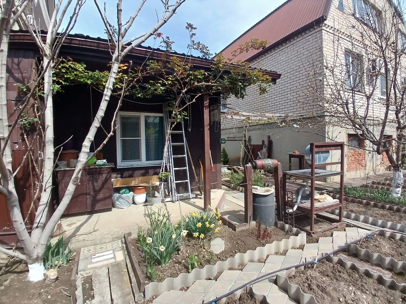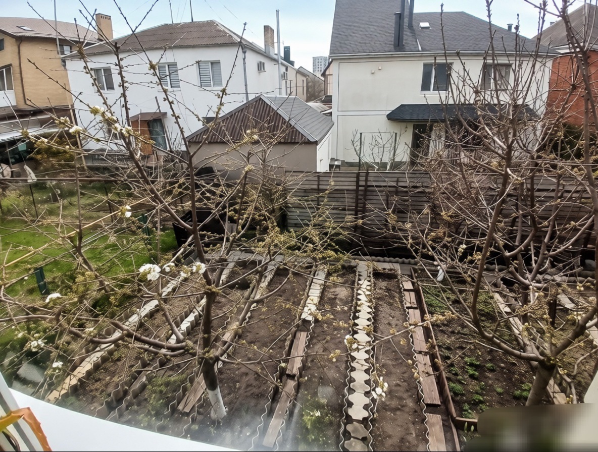 · В саду — черешня, инжир, виноград, розы. Земля плодородная, можно выращивать овощи.
