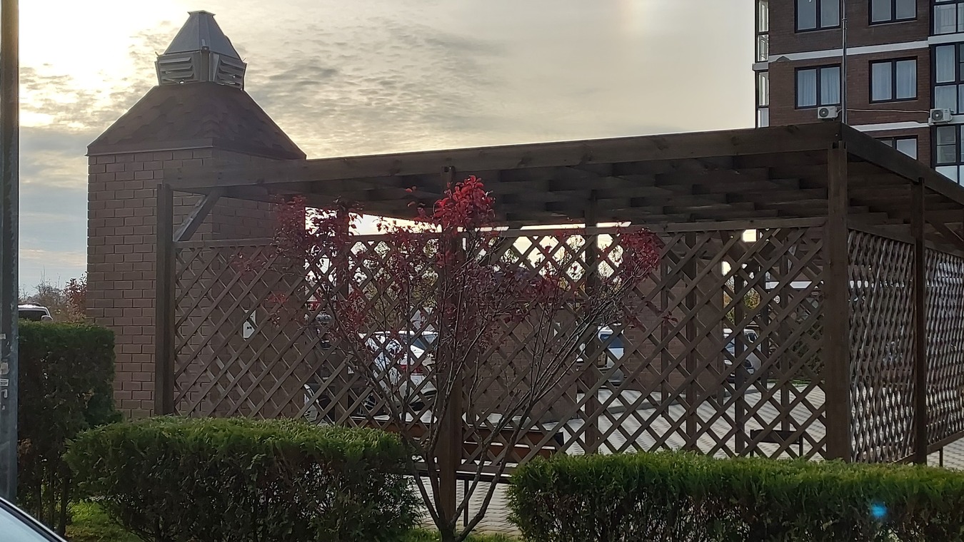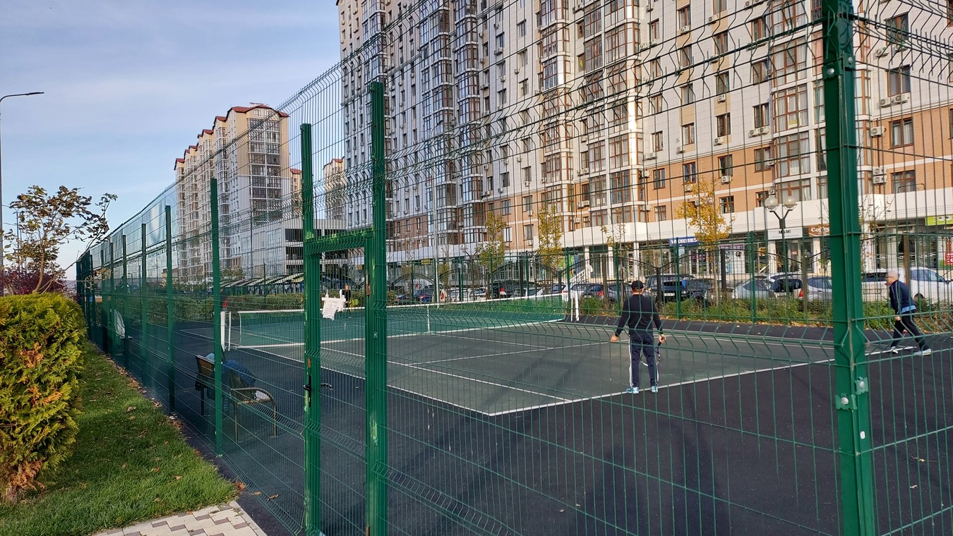 Двор очень благоустроенный и зеленый. Беседки, зоны барбекю, прогулочные зоны, теннисный корд.