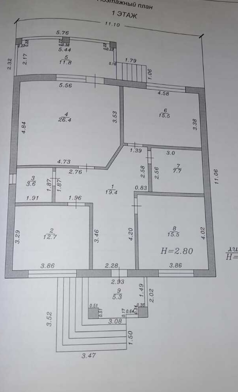 Высота потолков составляет 2,8 метра.