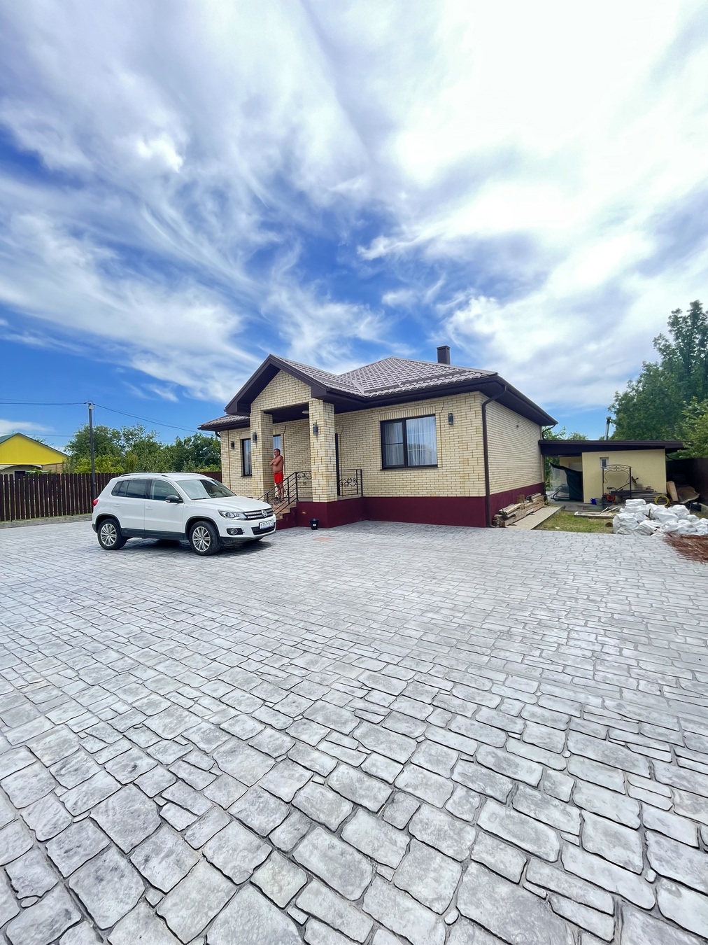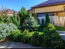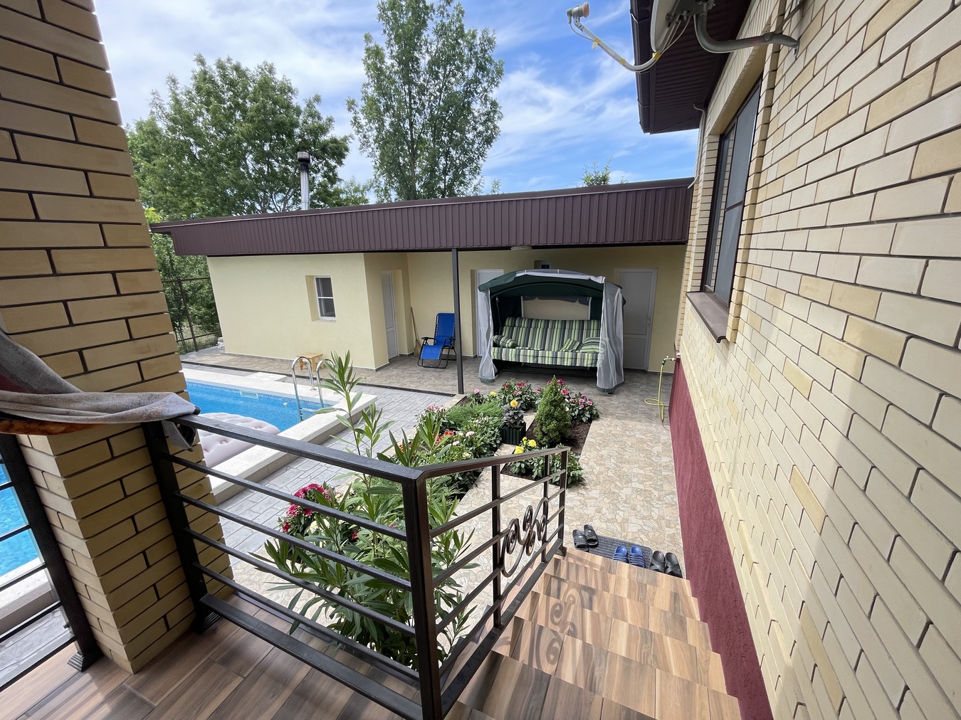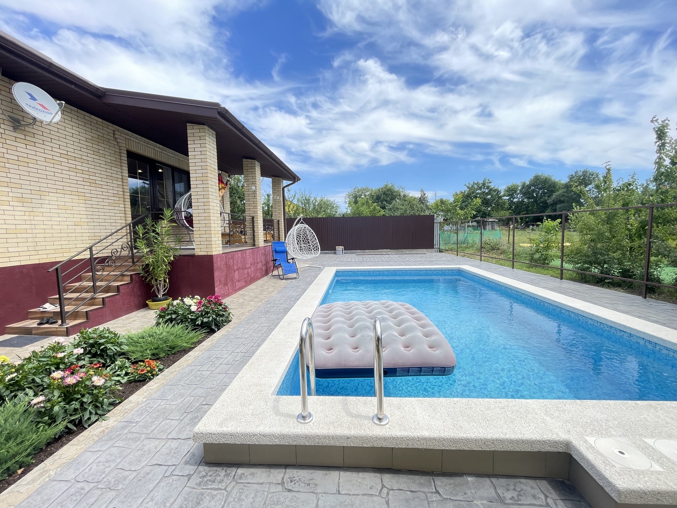 Придомовая территория благоустроена: имеется бассейн 4*6, баня на дровах, тротуарная плитка и забор из металлического штакетника с кирпичными опорами.
