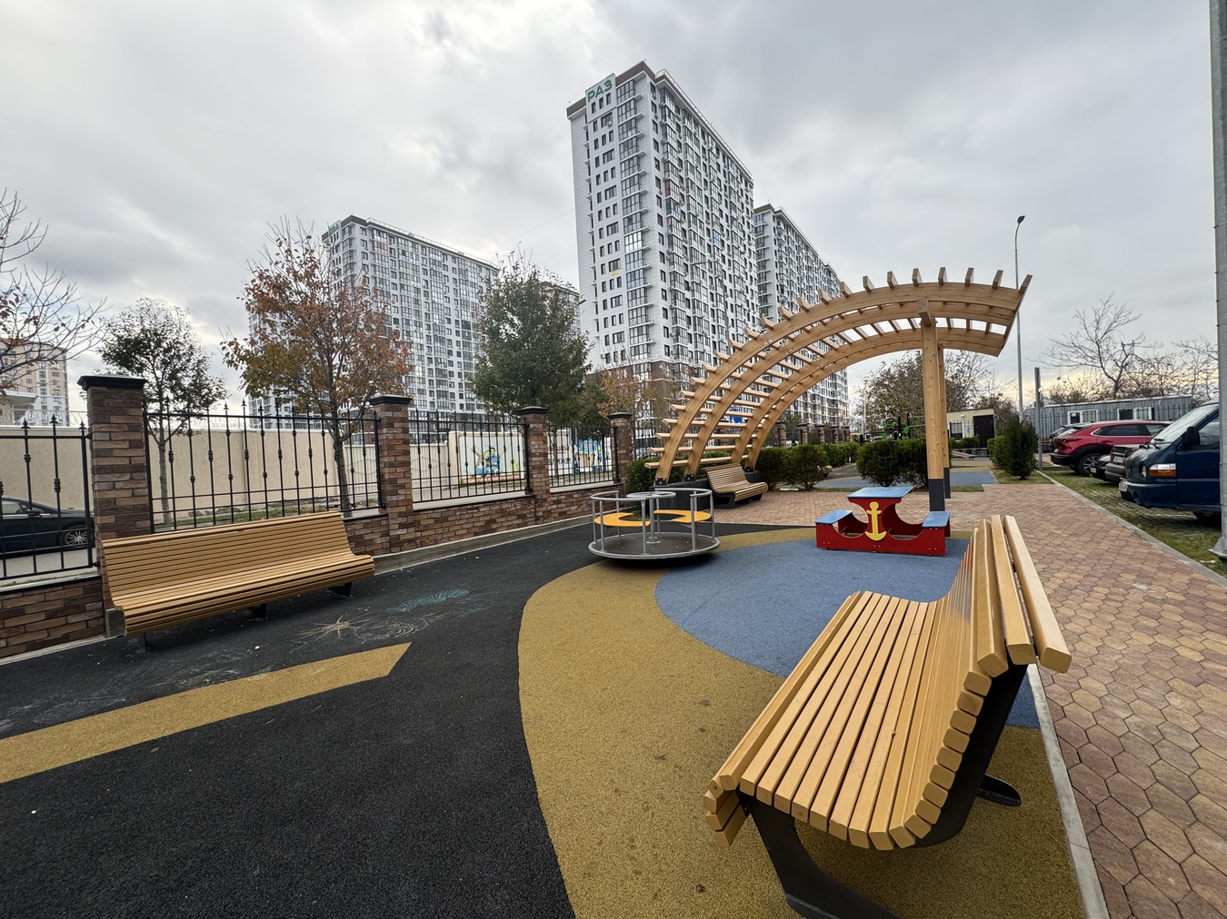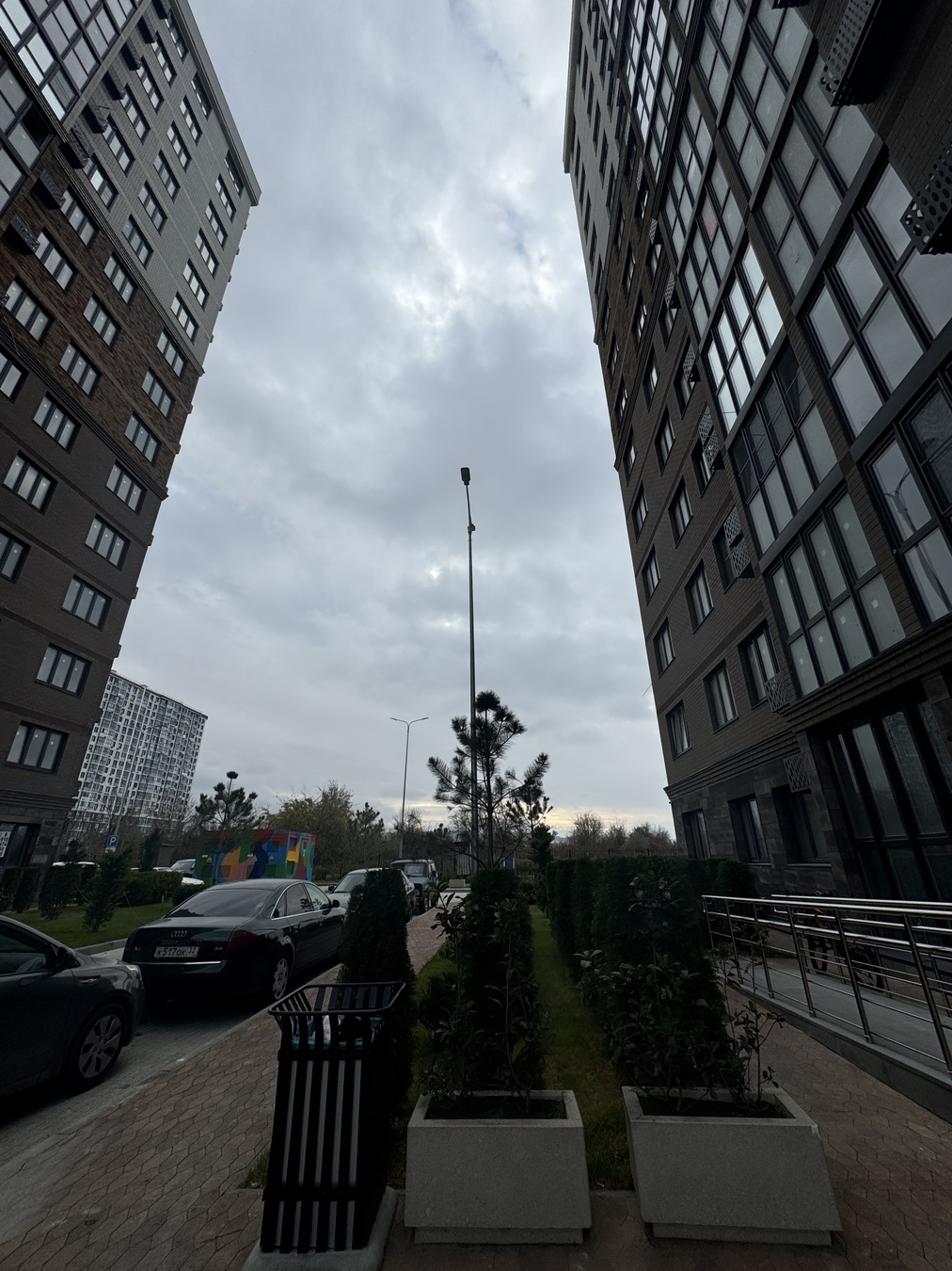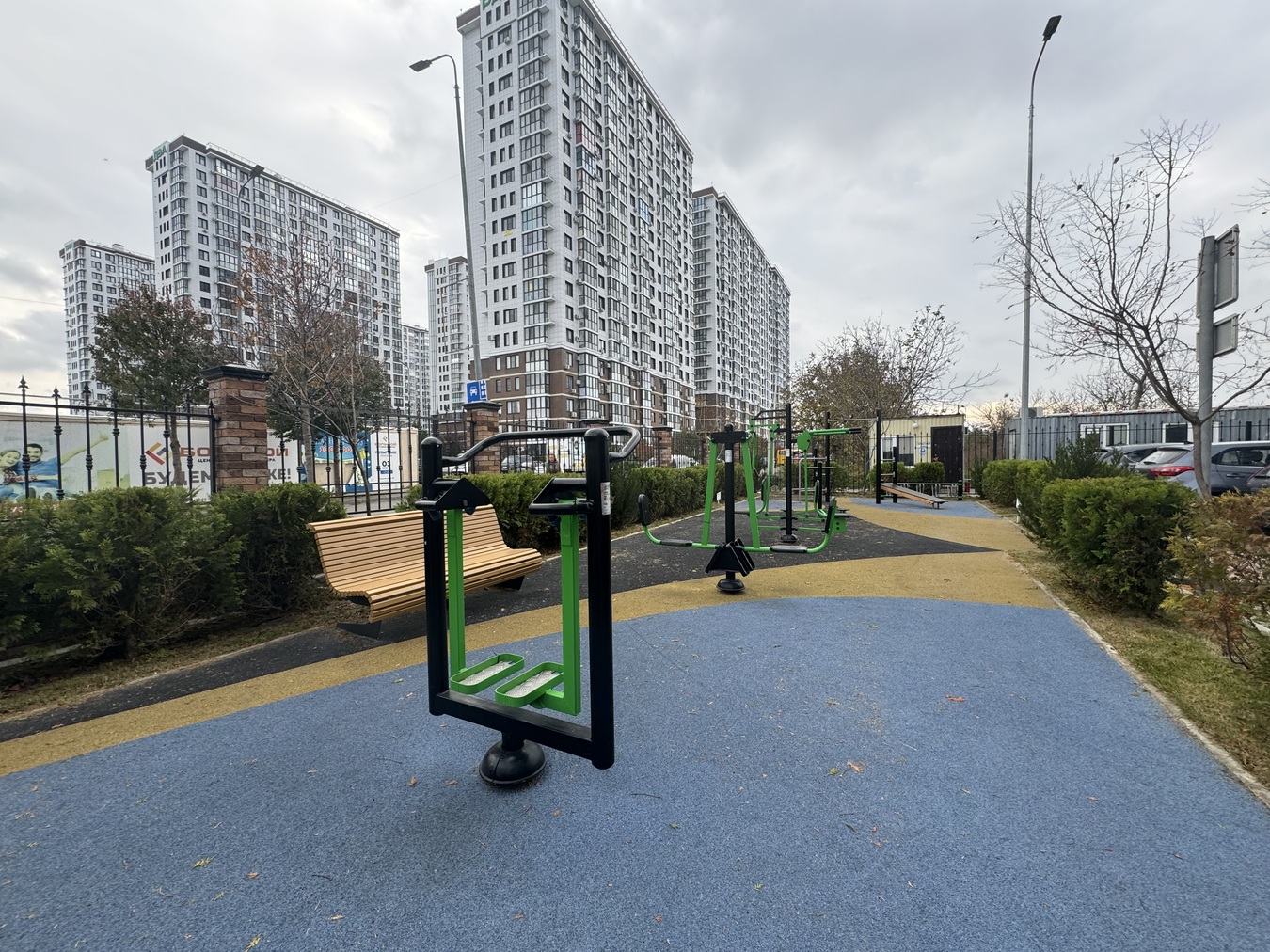 Закрытая территория с ограниченным движением автомобилей, детские площадки, множество зелени с автоматической системой полива, комфортные пешеходные дорожки, подземный и надземный паркинг.
