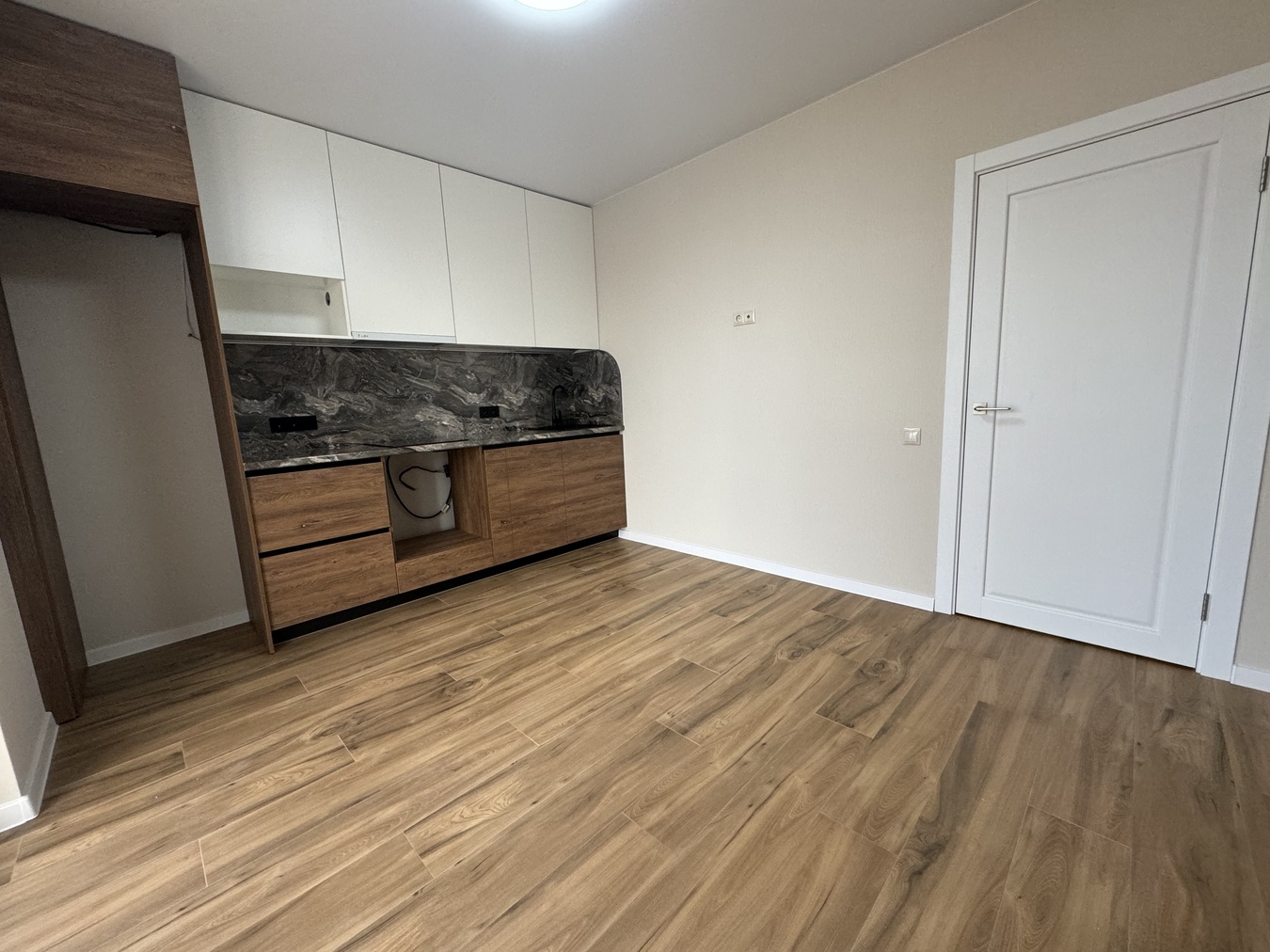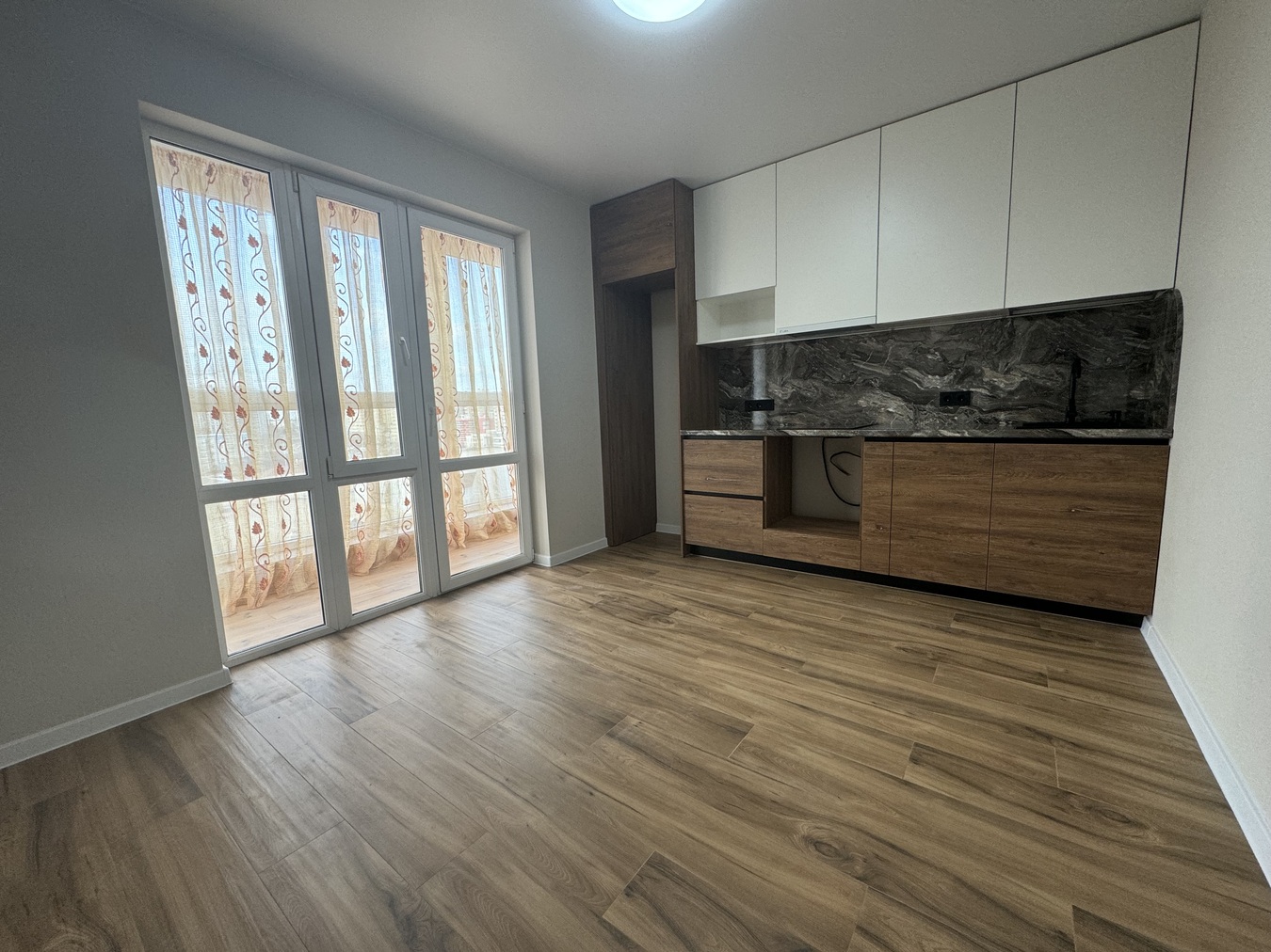 На стенах современные качественные обои,на полу в комнате ламинат, кухня и с/у плитка.