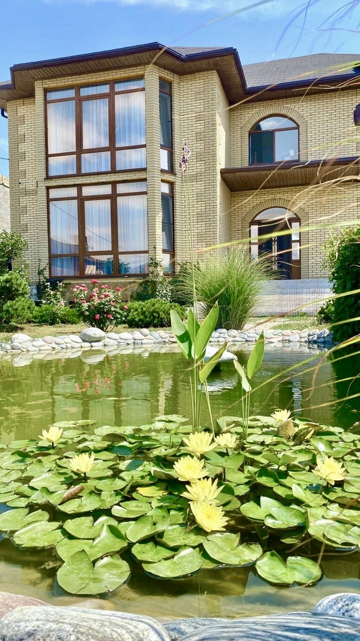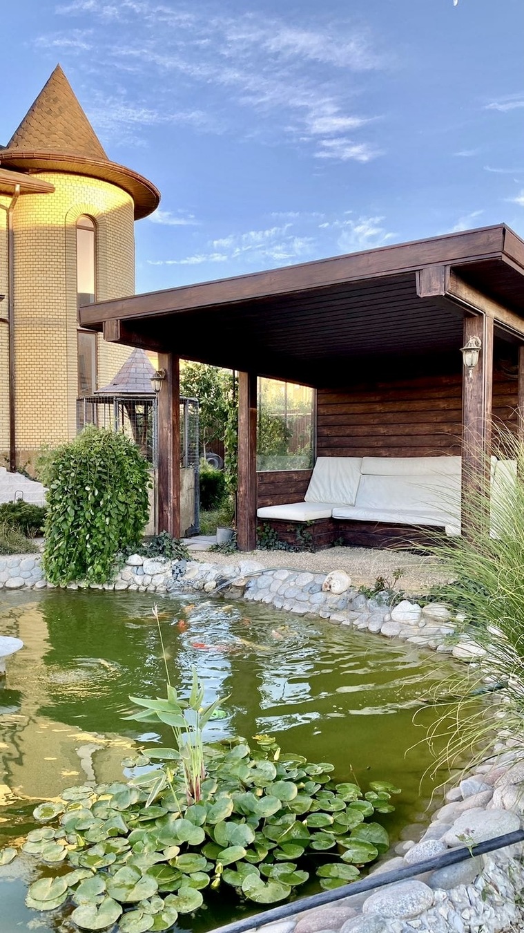 - Живописный пруд 6×7 м с японскими карпами Кои