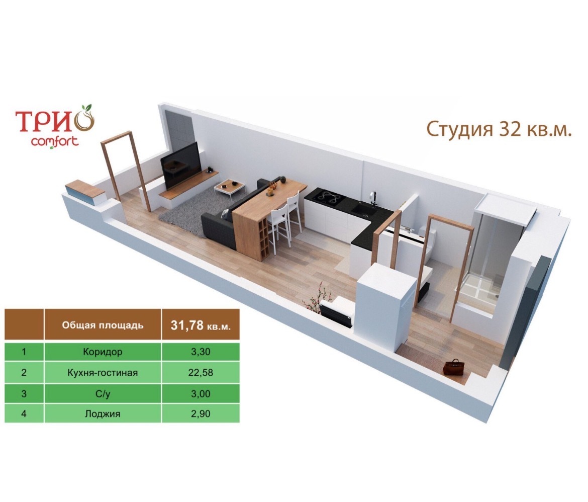 Просторная студия в новом современном ЖК «Трио-Комфорт»
