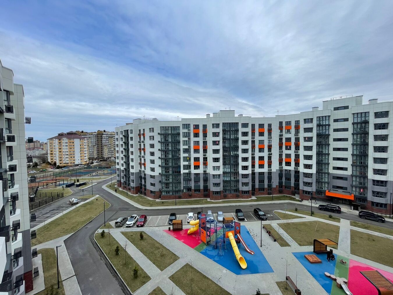 Много парковочных мест, на территории есть современные детские площадки, зоны отдыха.