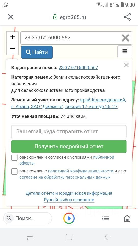 Собственник продает 1\2 долю земельного участка, от общей площади 7,44 Га, кадастровый номер участка 23:37:0716000:567. Земельный участок категории сельскохозяйственного назначения, для сельскохозяйственного производства, по фасаду участка проходит граница земель "населённых пунктов", так же вдоль фасадной границы участка проходит электричество питающее х. Красный от Анапы. На участке имеется точка доступа к газу высокого давления. Море находится в 2,8 км, вокзал — 1 км, до центра Анапы — 5 км. К участку ведет асфальтно-бетонная дорога. Участок можно найти на публичной кадастровой карте. Подробности по телефону или электронной почте. Так же рассмотрю варианты обмена на 1 или 2х ком. кв. с вашей доплатой в Краснодаре!
