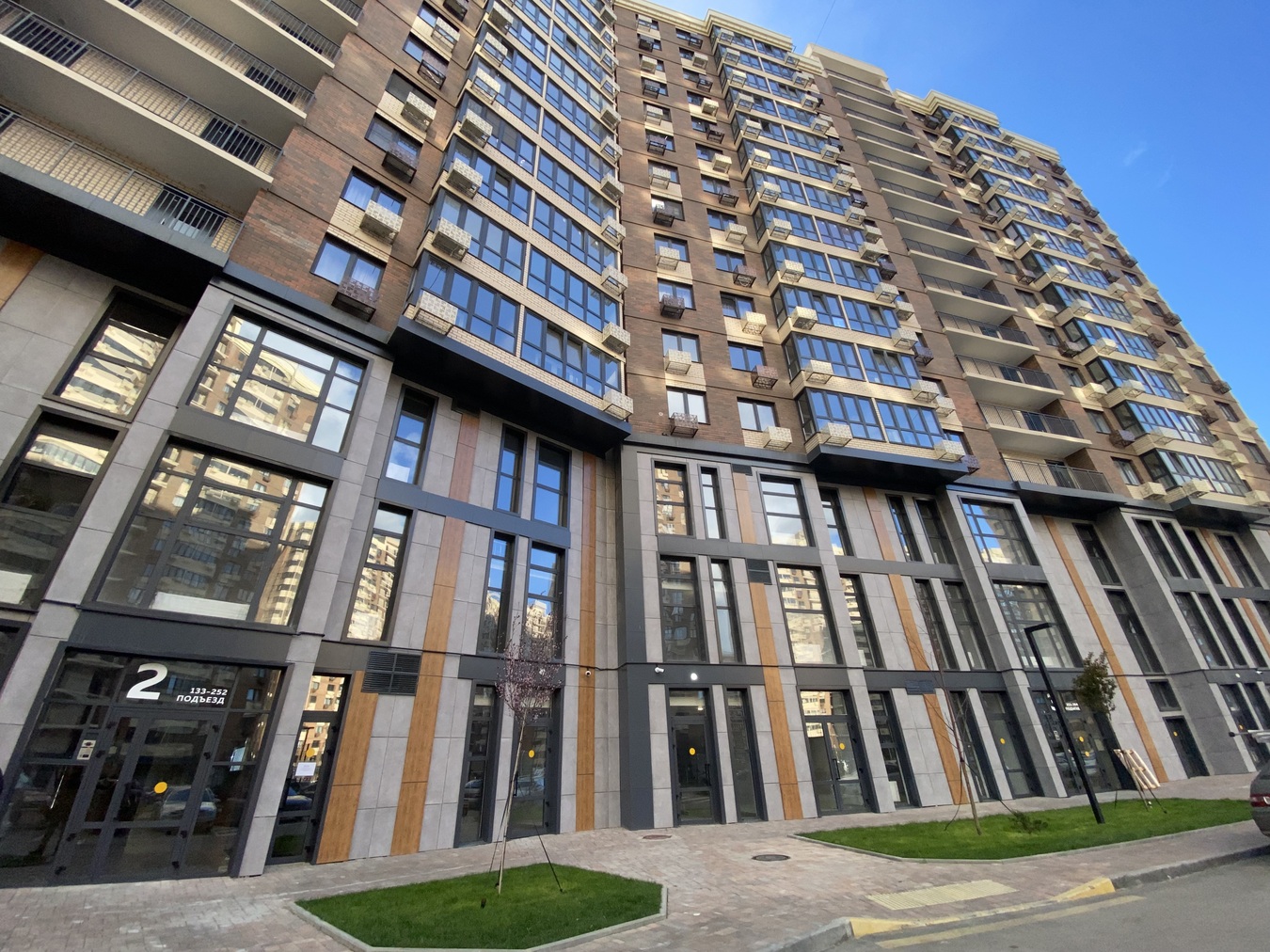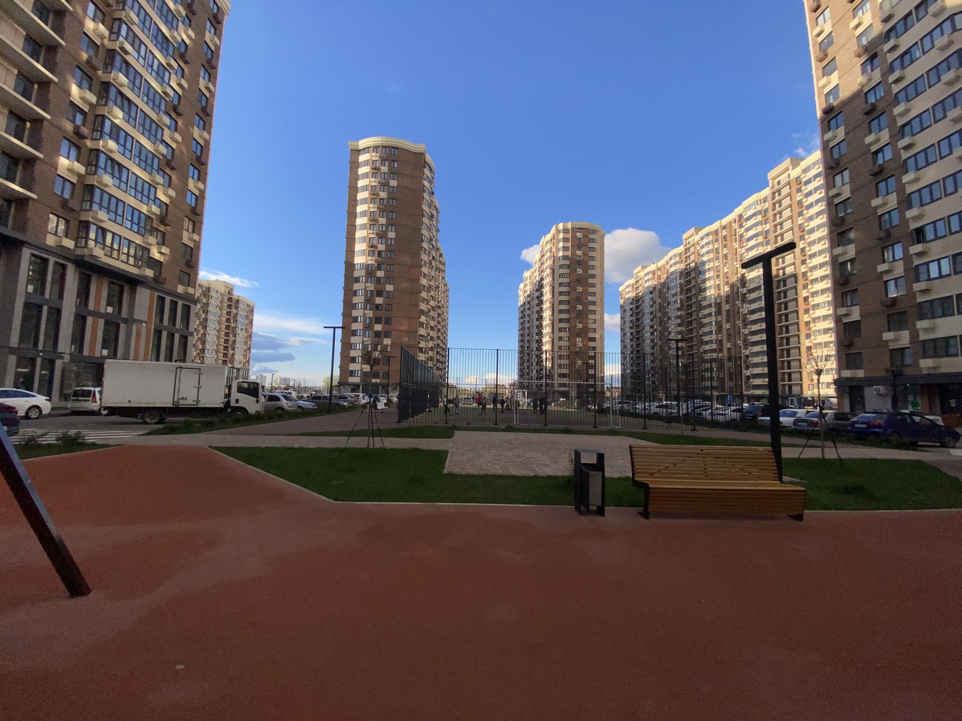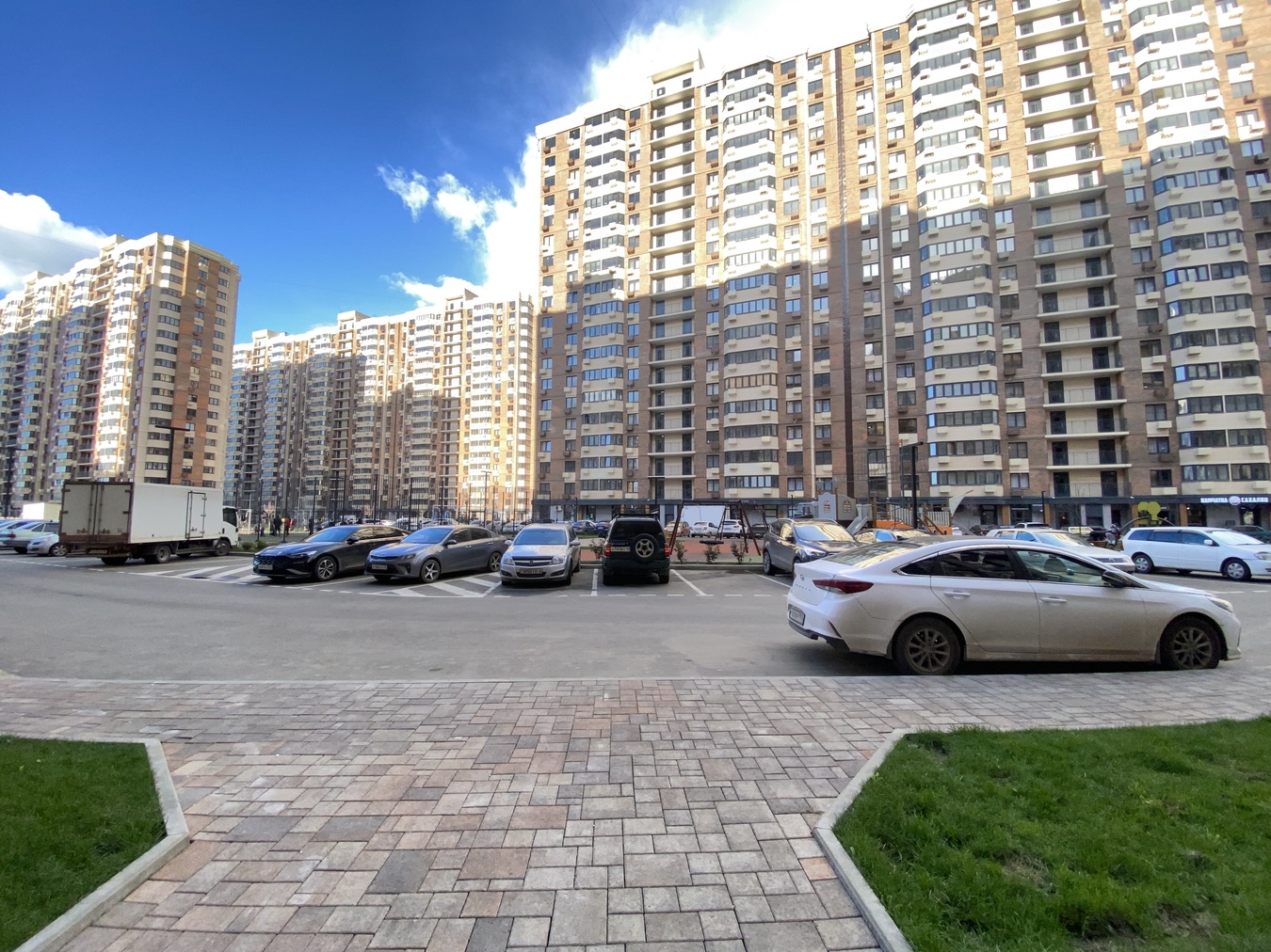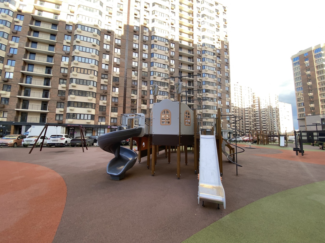 Есть подземная парковка, современные детские и спортивные площадки, большое количество парковочных мест на улице.