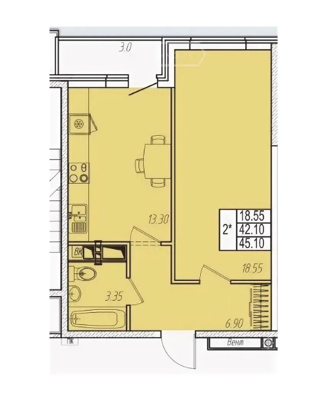площадью 45 метров.